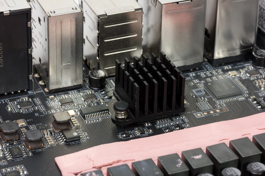 Для всех трех слотов M.2 предусмотрены радиаторы с термоинтефейсом. Верхний радиатор — самостоятельный и имеет утолщения для более качественного охлаждения. Два нижних радиатора прикрепляются к чипсетному радиатору, который в плане охлаждения им «помогает».