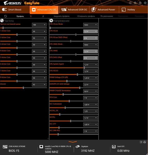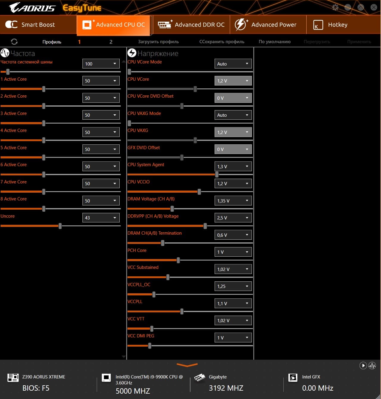 - Частоты работы процессора —5,0 ГГц (по всем ядрам), напряжение — 1,35—1,43 В