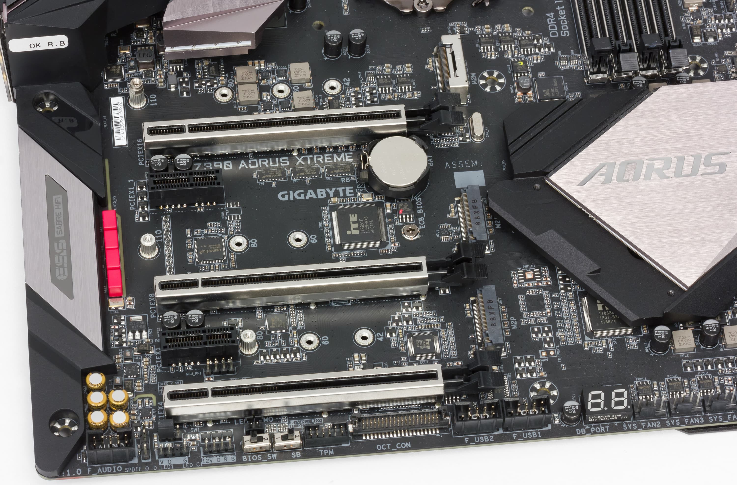 Всего у платы 6 разъемов Serial ATA 6 Гбит/с + 3 слота для накопителей в форм-факторе M.2. (Еще один слот M.2, спрятанный под кожухом блока разъемов задней панели, занят контроллером беспроводных сетей Wi-Fi/Bluetooth.)