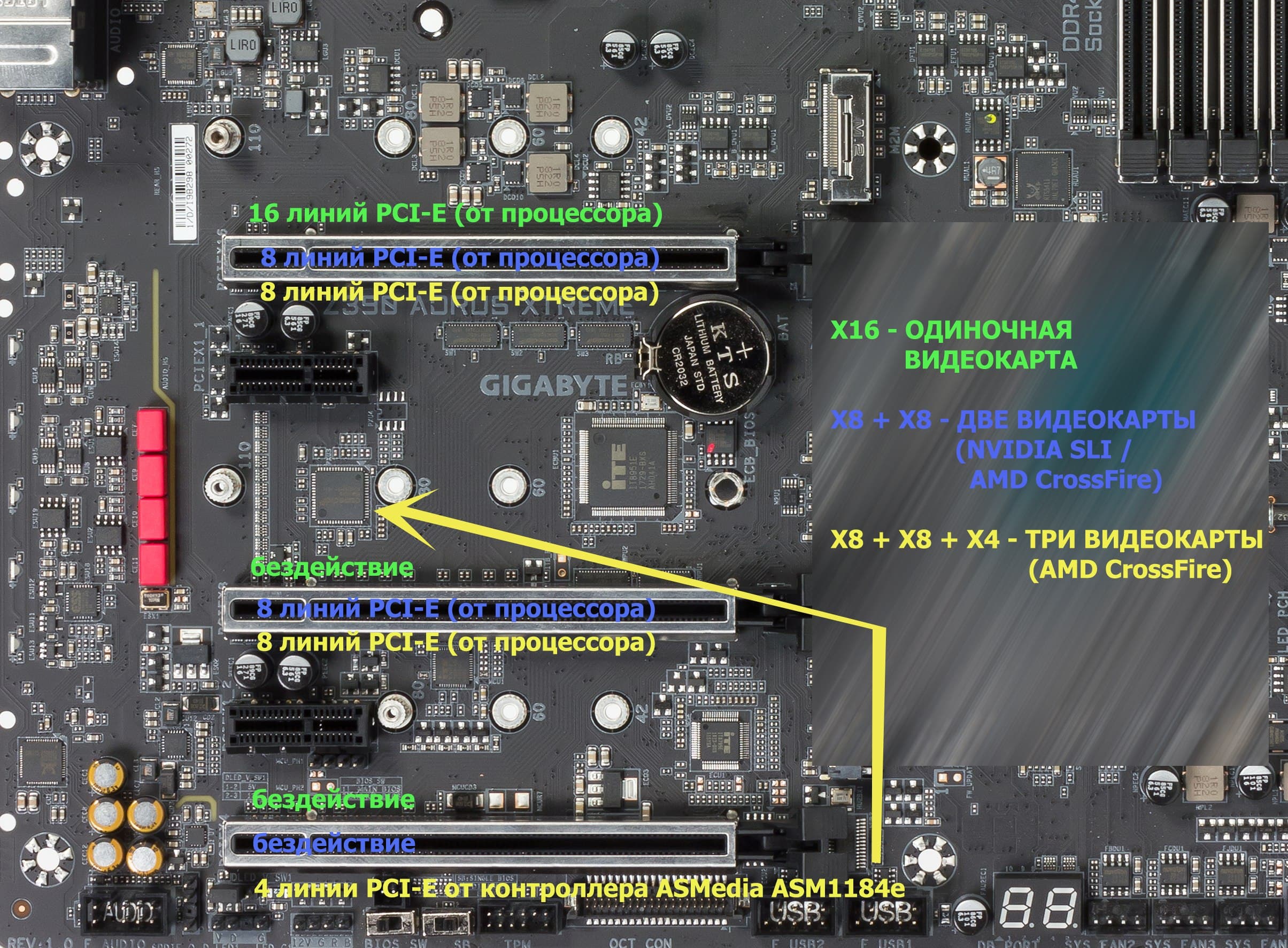 У процессора есть 16 линий PCI-E 3.0, они идут только на слоты PCI-E x16, но для трех «длинных» слотов этого недостаточно. Вот так выглядит схема распределения: