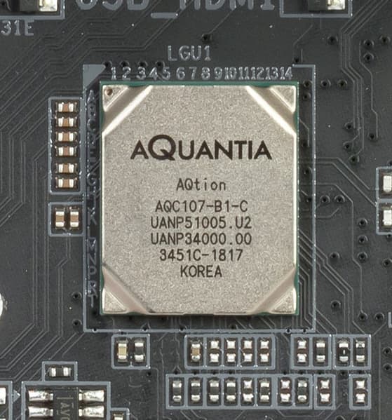Также имеется современный сетевой контроллер Aquantia AQtion AQC107 с максимальной скоростью передачи данных 10 Гбит/с (его разъем RJ-45 — красного цвета). На настоящий момент это не особенно актуально. Ведь даже проверить работу контроллера просто негде: все имеющиеся бытовые сетевые устройства (роутеры и контроллеры) рассчитаны максимум на 1 Гбит/с.