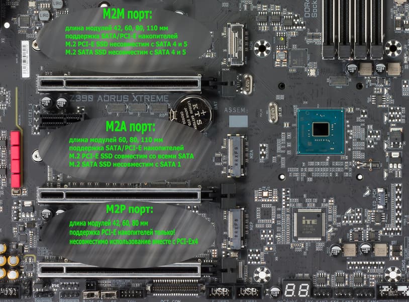 На коллаже выше объяснено, что верхние два слота M.2 поддерживают все виды накопителей (SATA и PCI-E), а нижний — только PCI-E.