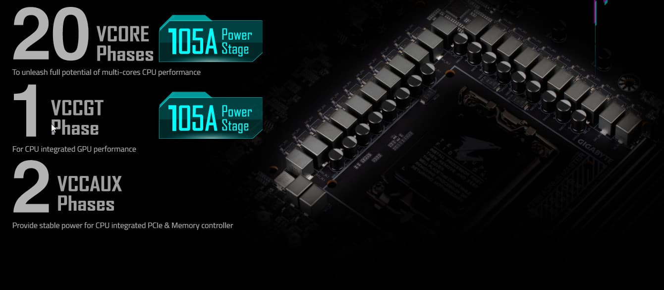Схема питания процессора выполнена по схеме 20+2+1 (всего 23 фазы, 20 на VCore, 2 на VCCIO и 1 на интегрированное графическое ядро).