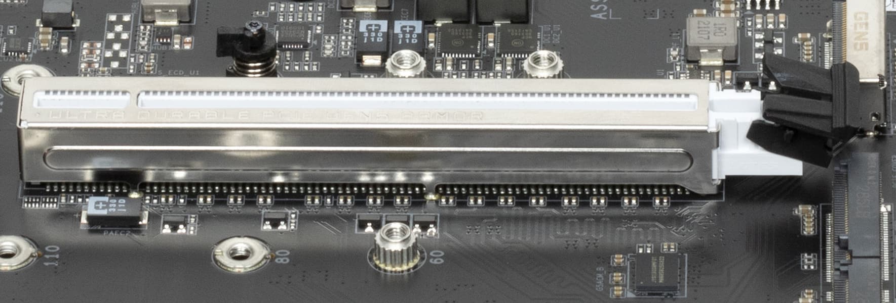 Все три слота PCIe x16 имеют металлическое армирование из нержавеющей стали, которое увеличивает их надежность. Кроме того, такая защита предохраняет слоты от электромагнитных помех.