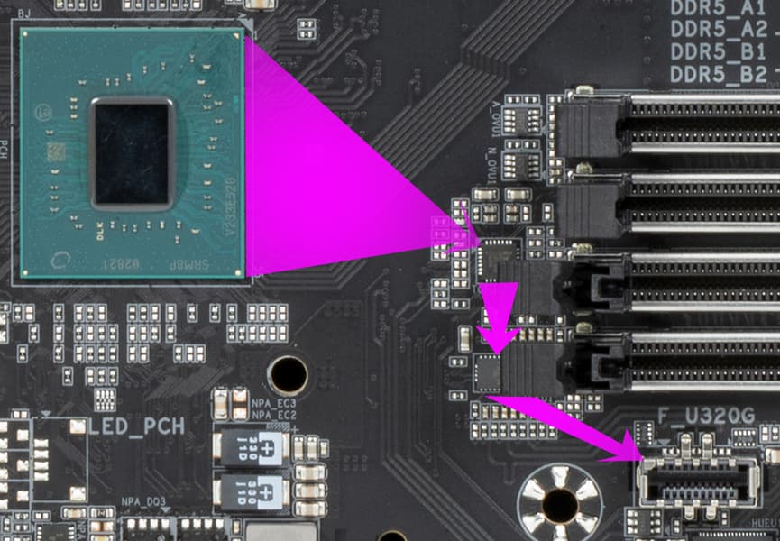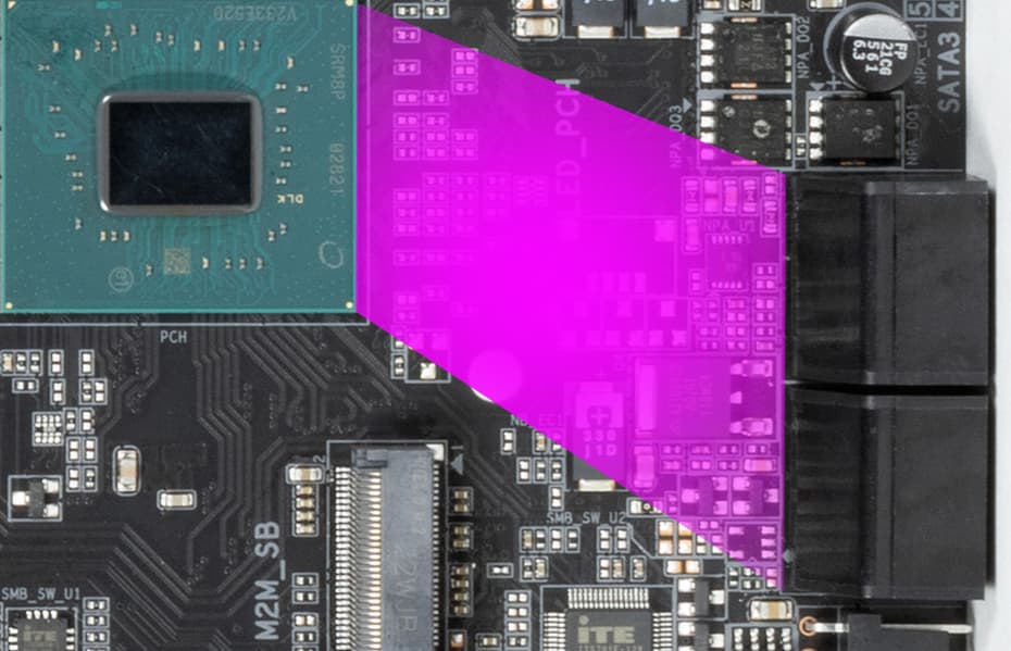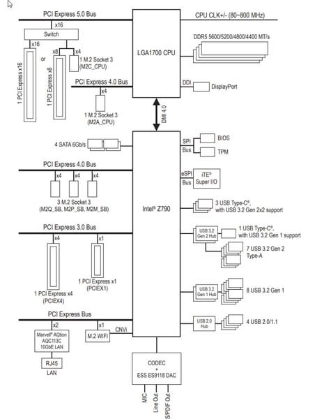 Процессоры Intel Core 13/12-го поколений (совместимые с сокетом LGA1700 и поддерживаемые Z790) имеют 20 линий ввода-вывода (16 PCIe 5.0, 4 PCIe 4.0), не имеют USB и SATA портов. При этом взаимодействие с Z790 идет по особому каналу Digital Media Interface 4.0 (DMI 4.0 x8). Все PCIe линии процессора идут на слоты расширения PCIe и порт М.2. Serial Peripheral Interface (SPI) используется для взаимодействия с системой UEFI/BIOS, а шина Low Pin Count (LPC) — для связи с устройствами ввода/вывода, не требующими высокой пропускной способности (контроллерами вентиляторов, TPM, старой периферии).