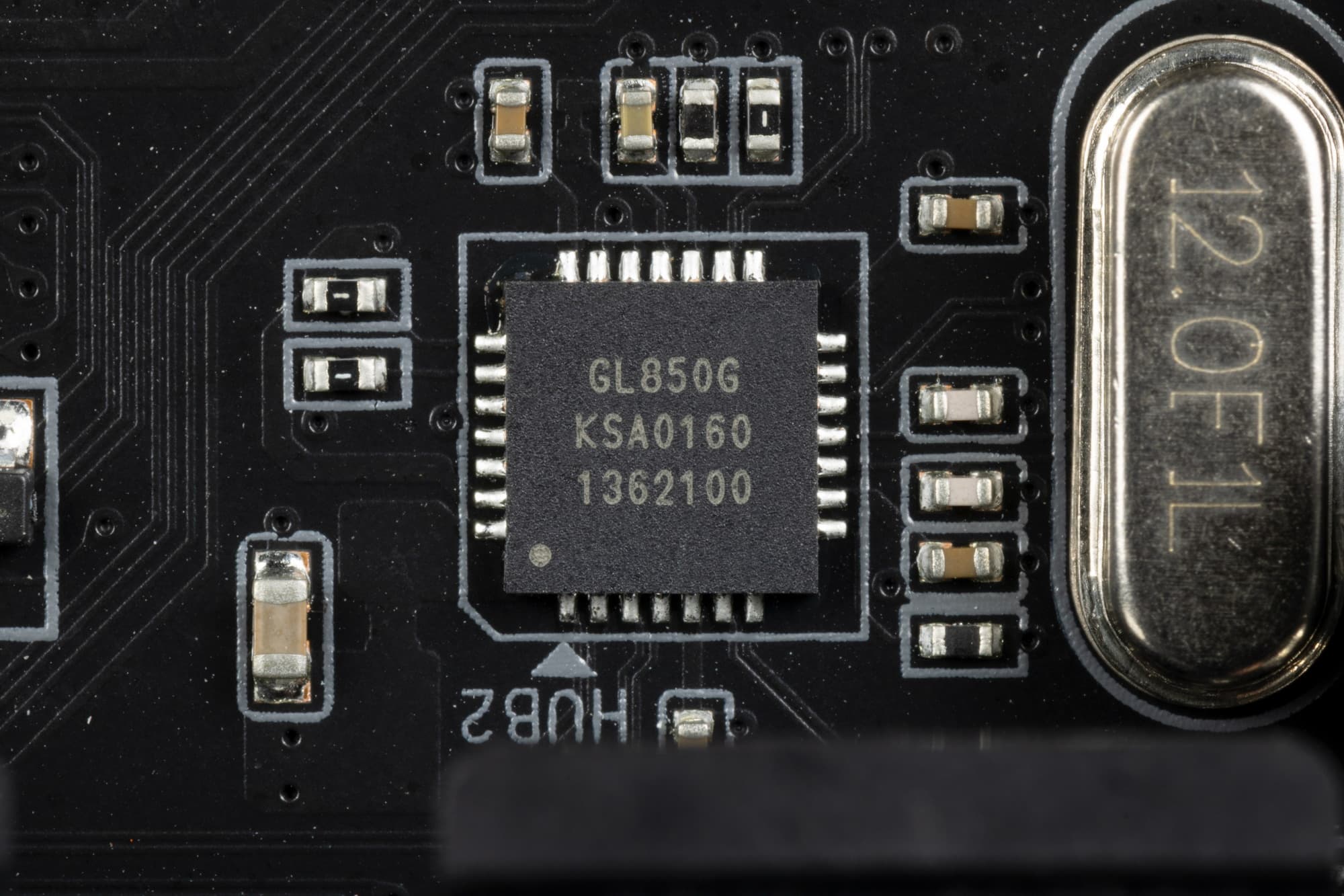 - 4 порта USB 2.0/1.1: все реализованы через контроллер Genesys Logic GL850G (на него потрачена 1 линия USB 2.0 от Z790) и представлены двумя внутренними разъемами (каждый на 2 порта).