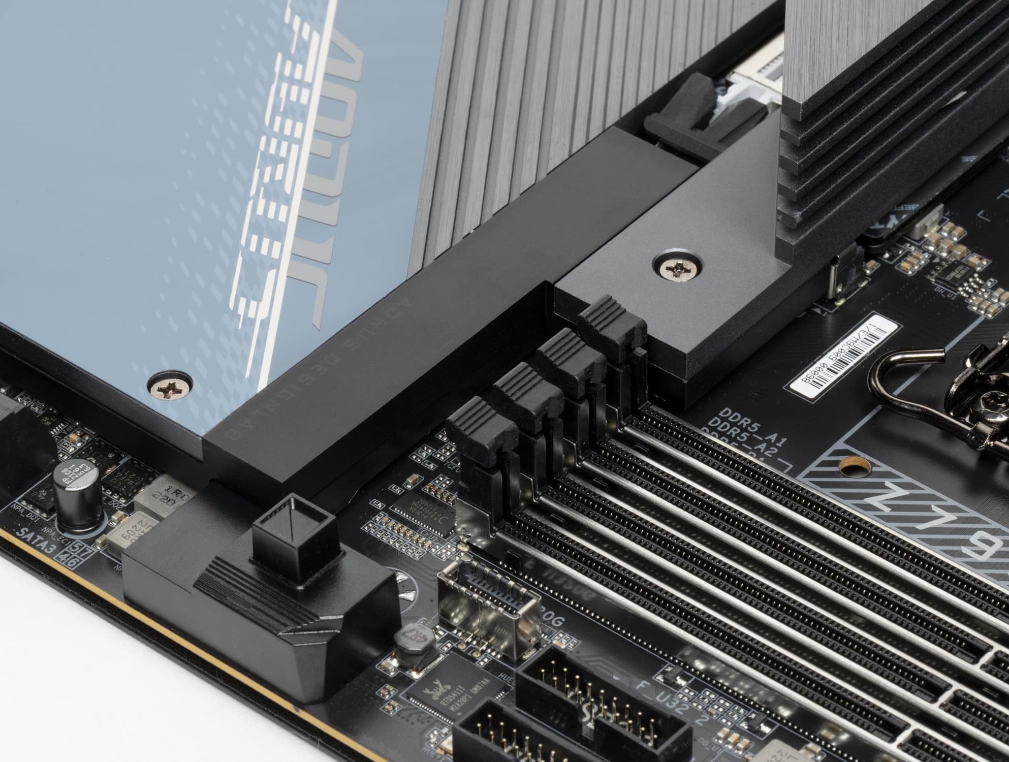 Действительно, подчас крайне неудобно дотягиваться до «хвоста» слота, где требуется нажать на защелку для разблокирования карты в слоте: ведь как правило, выше первого слота PCIe имеется M.2 слот с высоким радиатором, и до защелки даже пальцем не дотянуться.