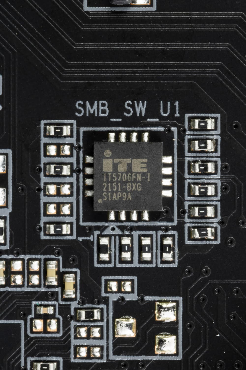 Для поддержания стабильных частот на шине PCIe (и для нужд оверклокеров) имеется внешний тактовый генератор. А также имеются усилители (ре-драйверы) сигнала PCIe 4.0 от ITE.