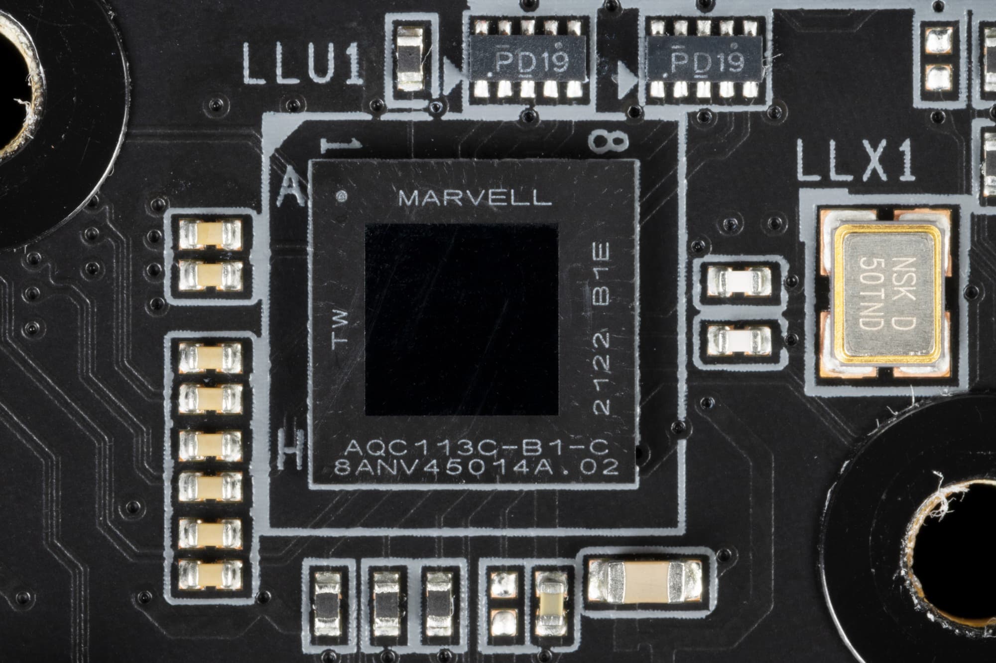 Материнская плата оснащена средствами связи очень даже хорошо. Имеется очень скоростной Ethernet-контроллер Marvell Aqtion AQC113, способный работать по стандарту 10 Гбит/с.