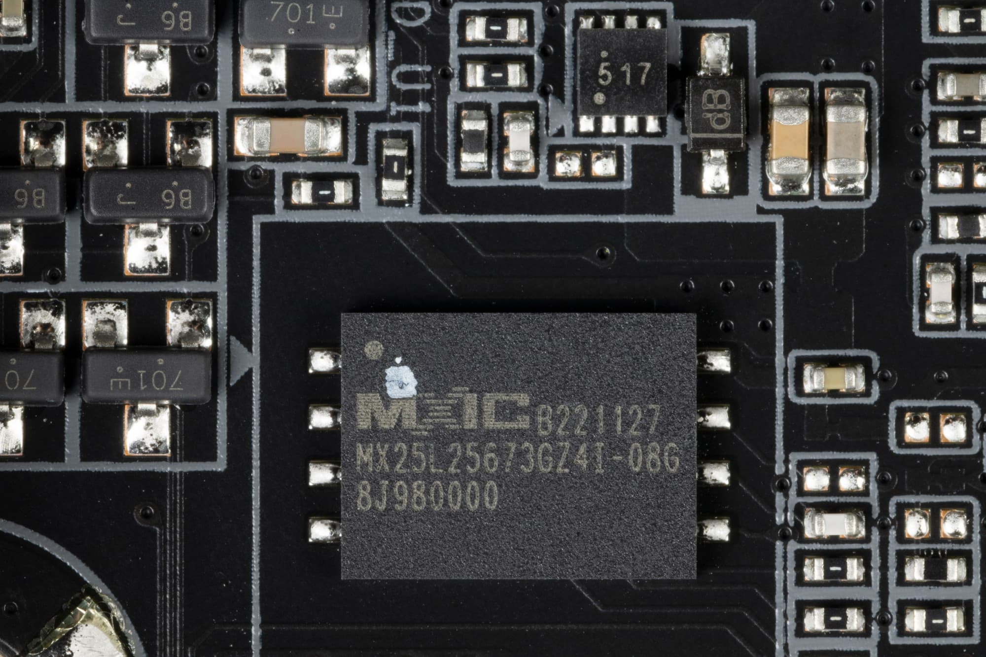 На оборотной стороне расположено несколько контроллеров и традиционная некоторая логика. Текстолит обработан хорошо: во всех точках пайки не только острые концы срезаны, но и все неплохо отшлифовано. На задней стороне установлена пластина из алюминия с наноуглеродным покрытием. Она помогает отводить тепло от задней стороны PCB через термоинтерфейс и обеспечивает жесткость материнской платы.