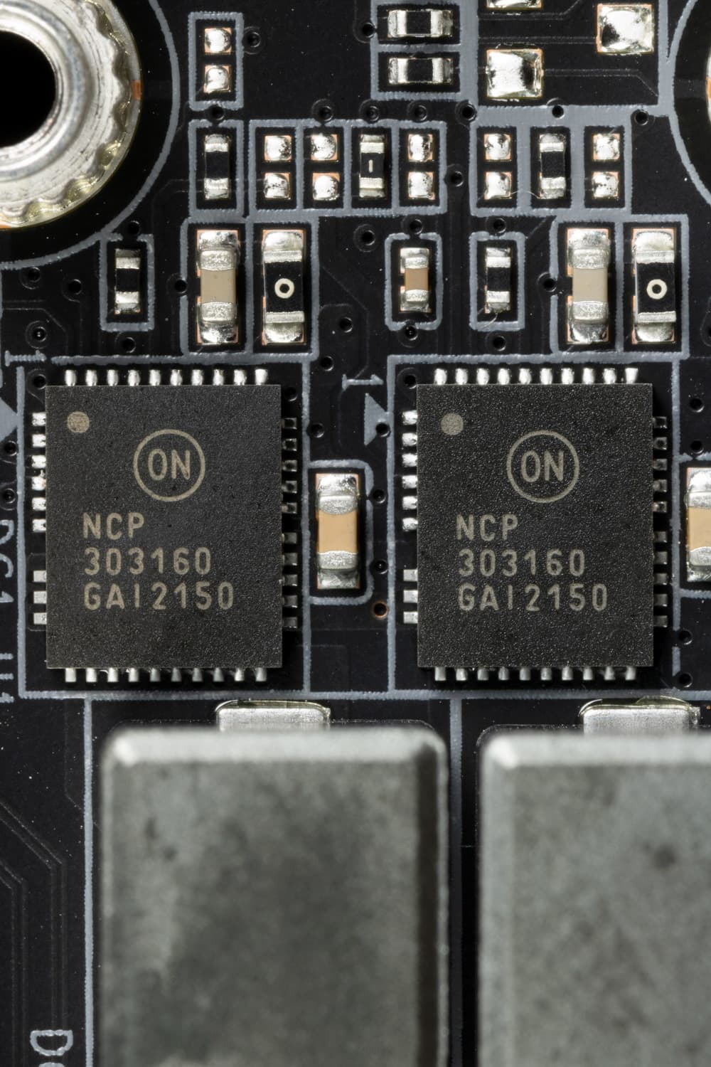 Каждый канал фазы имеет суперферритовый дроссель и RAA22010540 DrMOS от Renesas на 105 А.