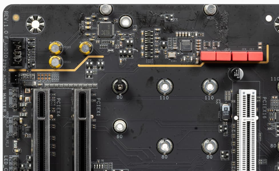 Выше я вел речь про первый PCIe x16_1, подключенный к процессору. Остальные два PCIe x16 подключены к Z790, и, несмотря на их форм-фактор, работают в режимах x1 и x4 соответственно.