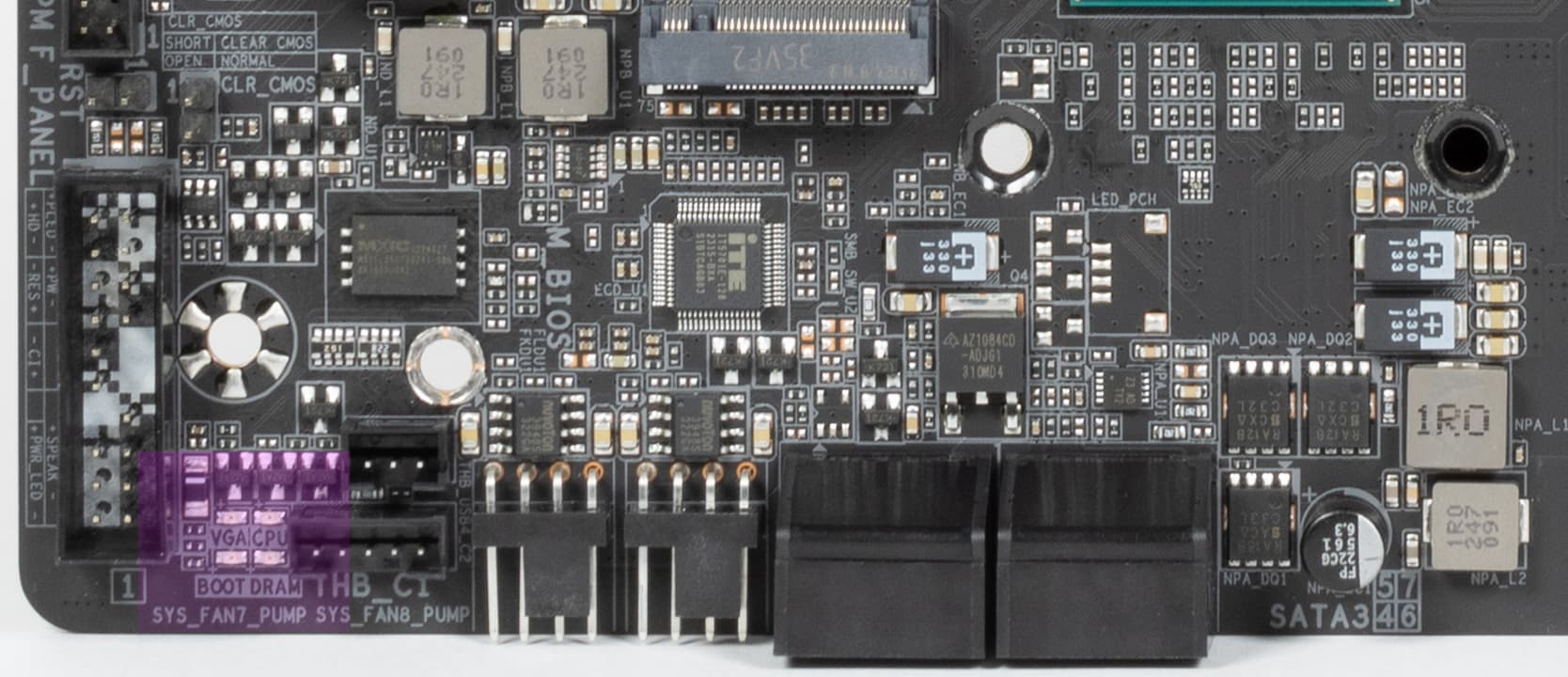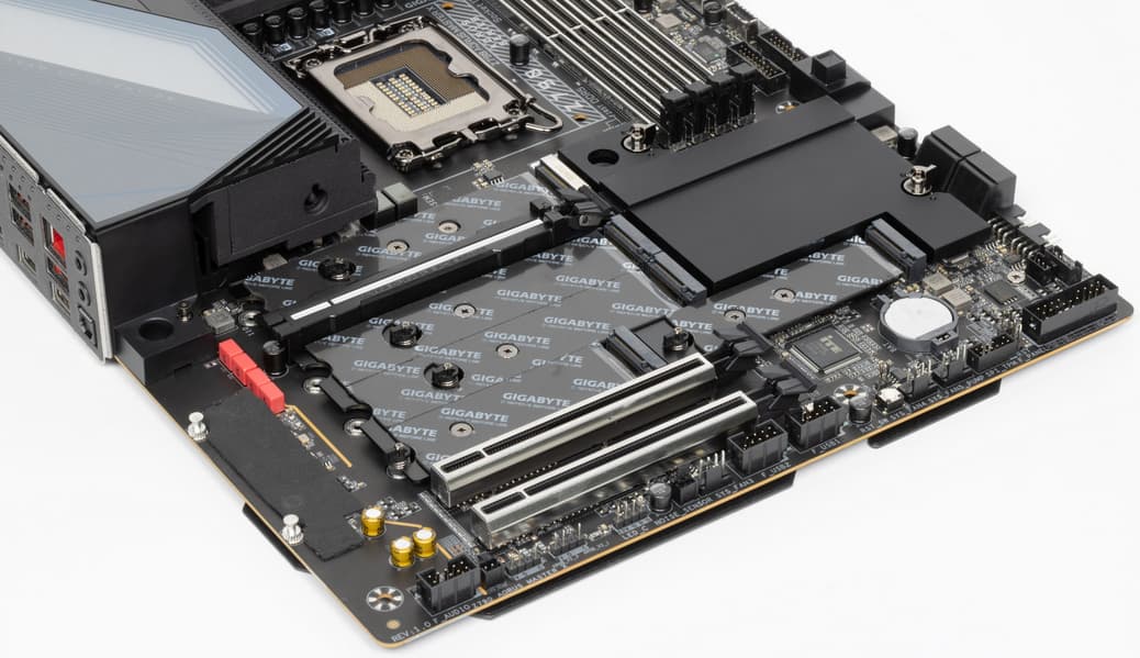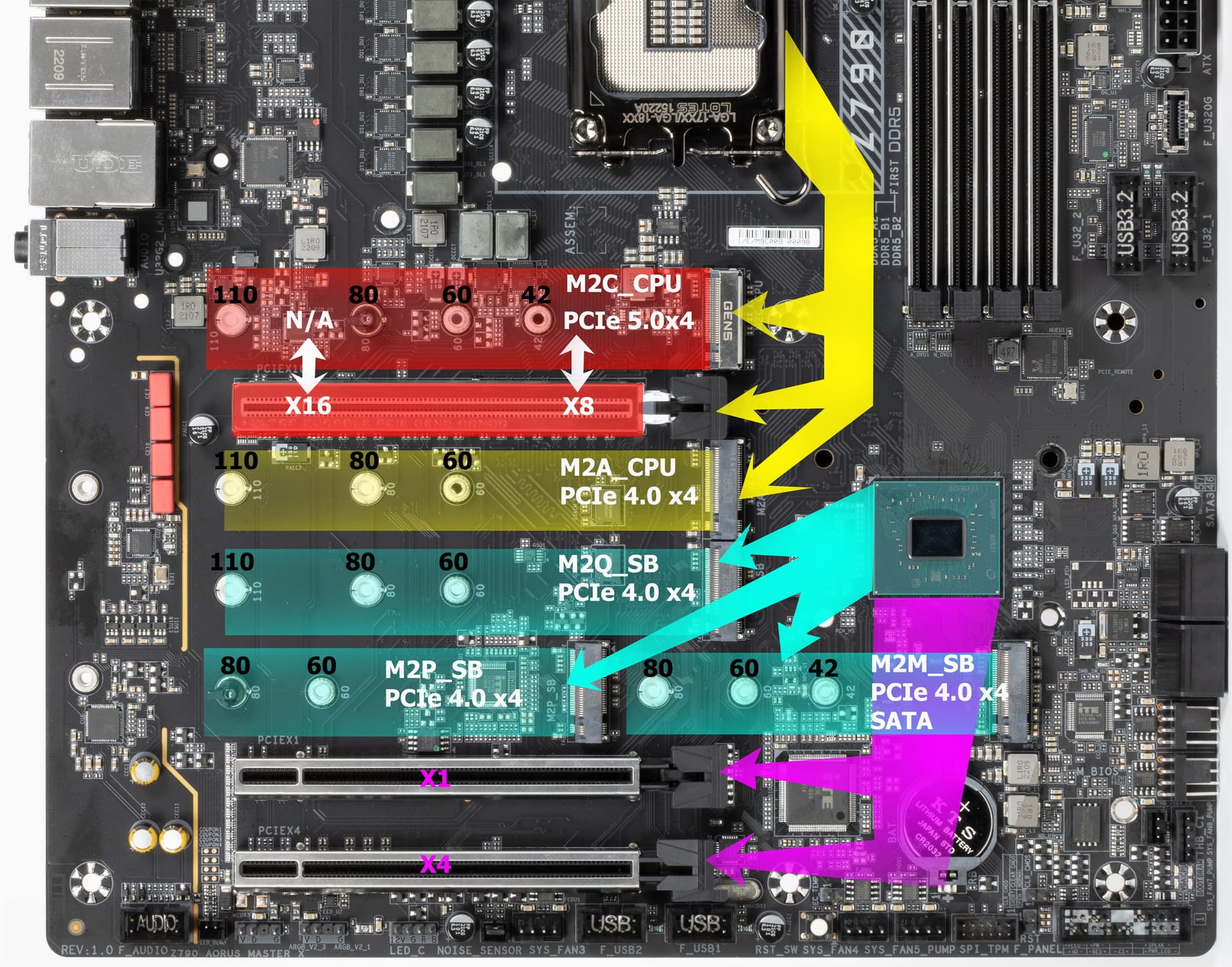 Третий, четвертый и пятый слоты M.2 (M2Q_SB, M2P_SB, M2M_SB) получают данные от чипсета Z790, а первые два — от CPU, при этом M2C_CPU получает PCIe 5.0, деля ресурсы со слотом PCIe x16_1 (о чем я уже выше рассказывал), а M2A_CPU штатно получает от процессора PCIe 4.0.