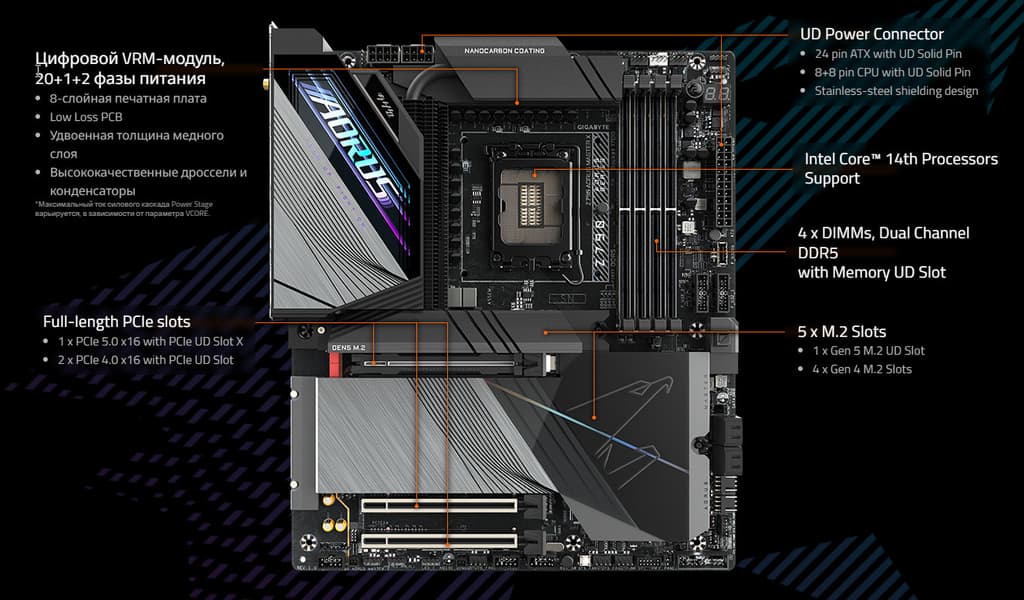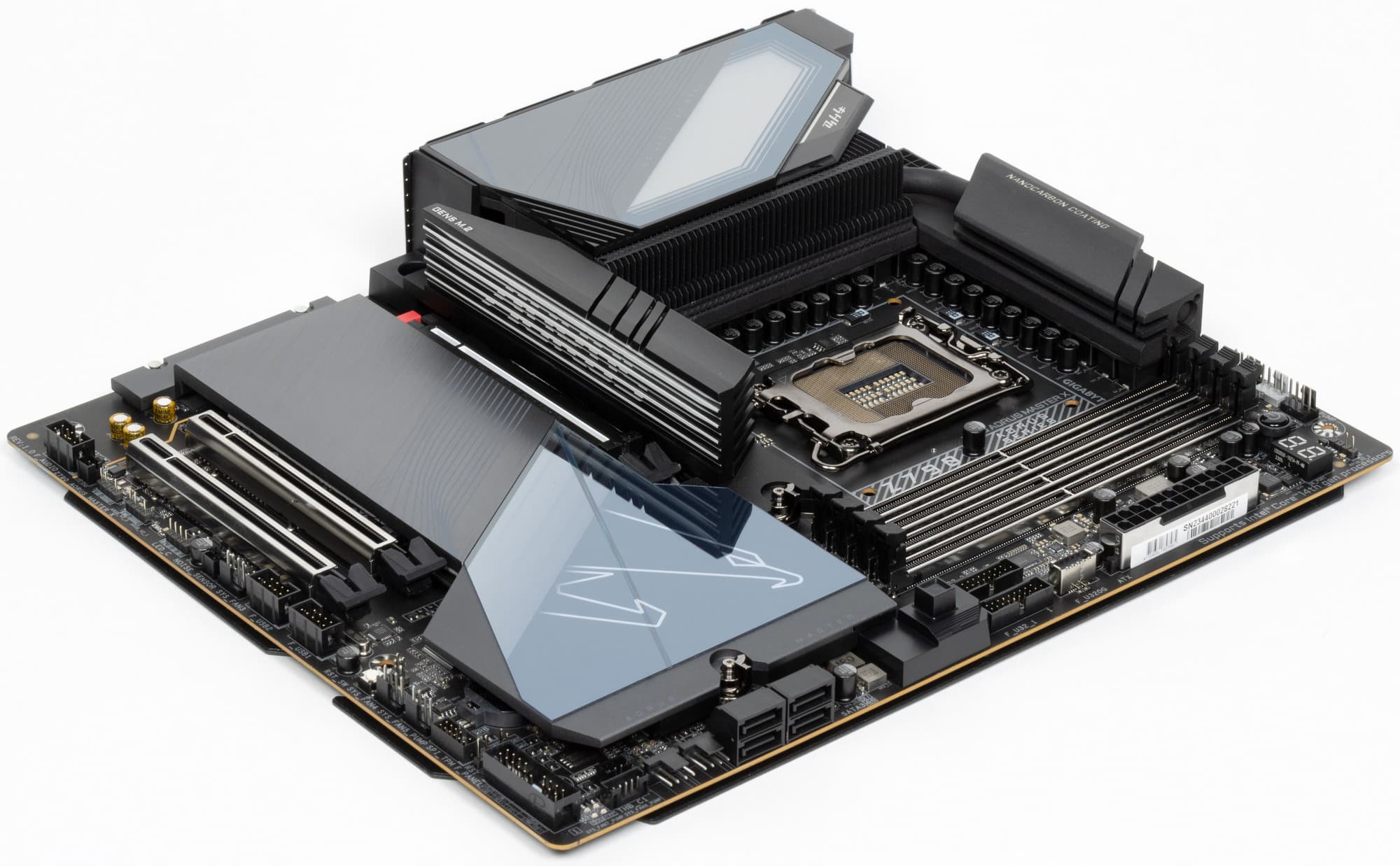 Переходим к герою нынешнего материала – материнской плате Gigabyte Z790 Aorus Master X, которая относится к топовому суббренду Aorus, поэтому перед нами почти флагман (мы помним, что самая-самая в этой линейке — материнка c суффиксом Xtreme, а Master — на ступень ниже). Суффикс «Х» в названии означает новую версию материнской платы, выпущенную ради выхода 14го поколения процессоров Intel, и такая версия обязательно обладает какой-то изюминкой. Но об этом позже.
