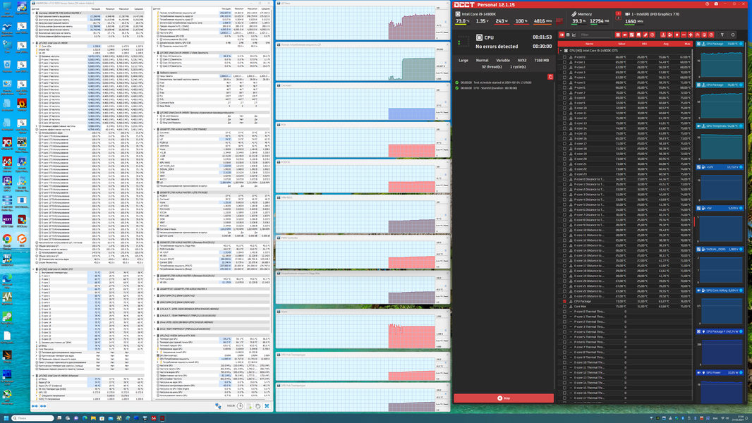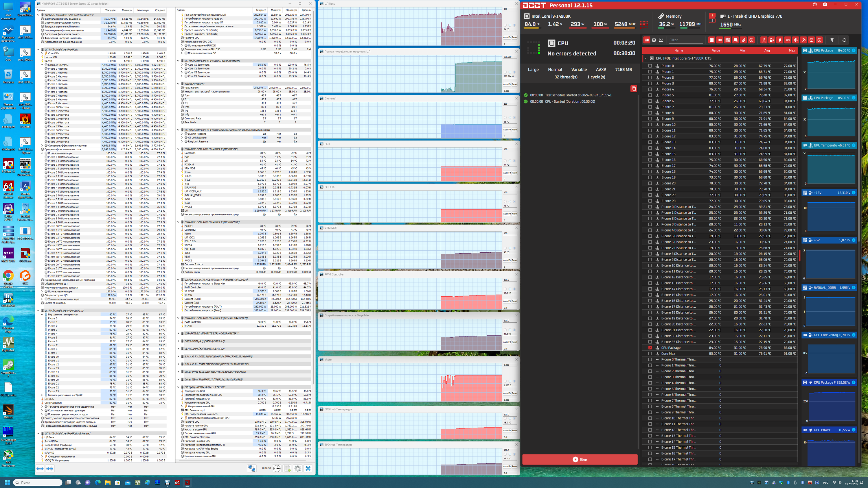Авторазгон позволил получить 5,7 ГГц по всем P-ядрам, и 4.4 ГГц по всем Е-ядрам, при этом потребление процессора уже перевалило за 290 Вт, но остальные все параметры по нагреву были в норме.