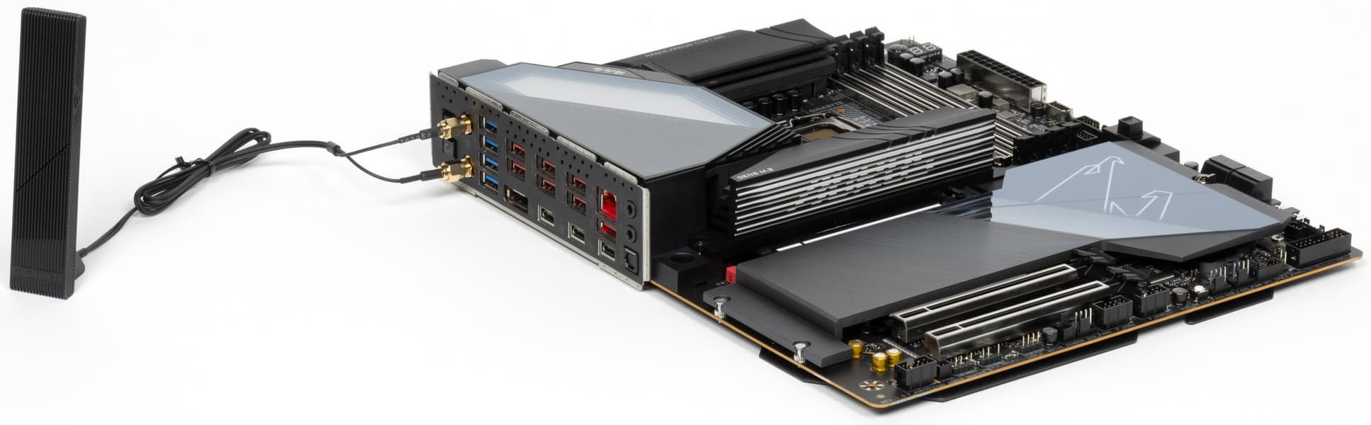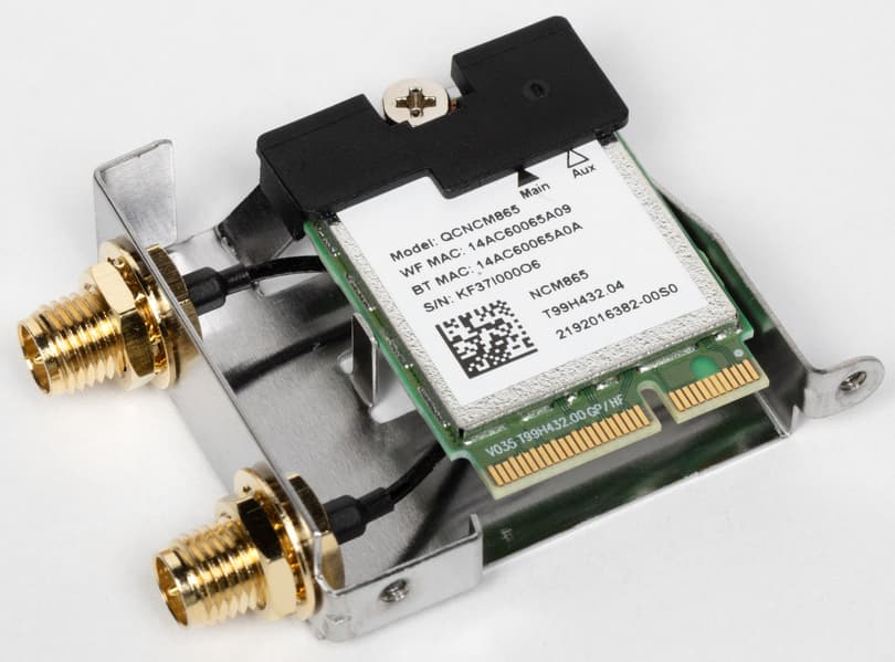 Имеется и комплексный беспроводной адаптер на контроллере Qualcomm QCNCM865, через который реализованы Wi-Fi 7 (802.11a/b/g/n/ac/ax/be, 2,4/5/6 ГГц) и Bluetooth 5.4. . Он установлен в слот M.2 (E-key), и его разъемы для привинчивания выносных антенн выведены на заднюю панель.