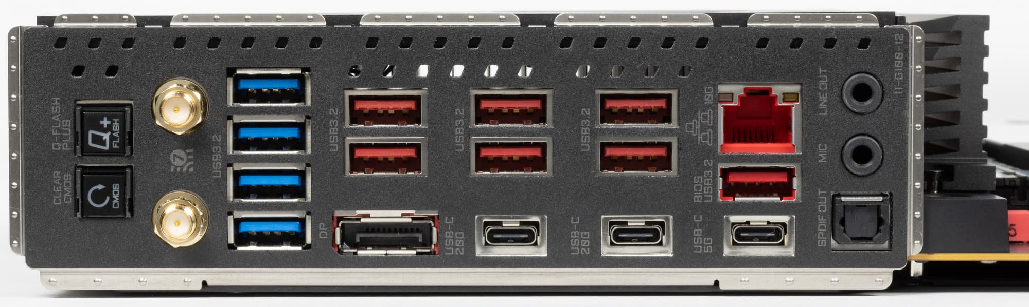 | Разъемы на задней панели | 3 × USB 3.2 Gen2x2 (Type-C) 7 × USB 3.2 Gen2 (Type-A) 4 × USB 3.2 Gen1 (Type-A) 1 × RJ-45 2 аудиоразъема типа миниджек 1 × S/PDIF (оптический, выход) 1 × DP 2 антенных разъема кнопка сброса CMOS кнопка перепрошивки BIOS — Q Flash Plus |