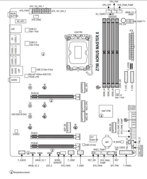 Форм-фактор ATX имеет размеры до 305×244 мм, а E-ATX — до 305×330 мм. Материнская плата Gigabyte Z790 Aorus Master X имеет размеры 305×260 мм, поэтому выполнена в форм-факторе E-ATX, и на ней имеются 9 монтажных отверстий для установки в корпус. Однако следует иметь в виду, что одно из девяти монтажных отверстий перекрыто радиатором для слота M.2.