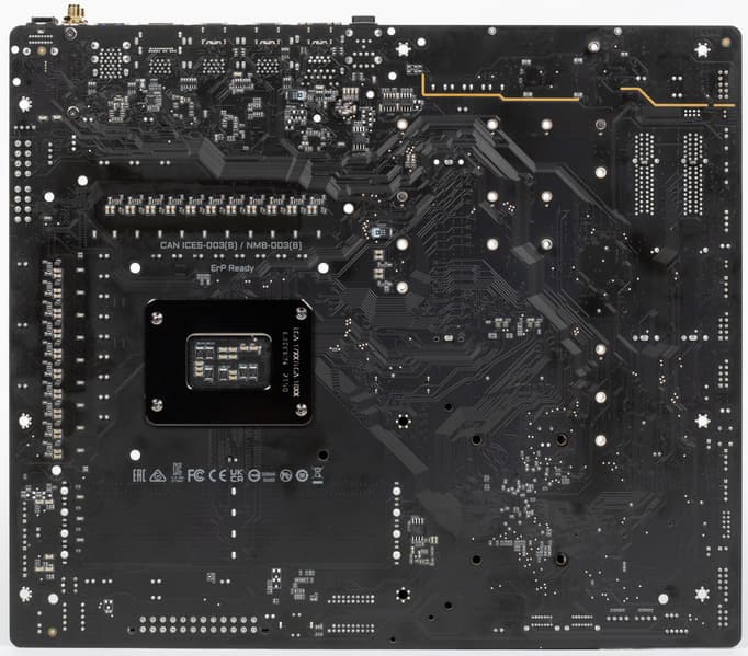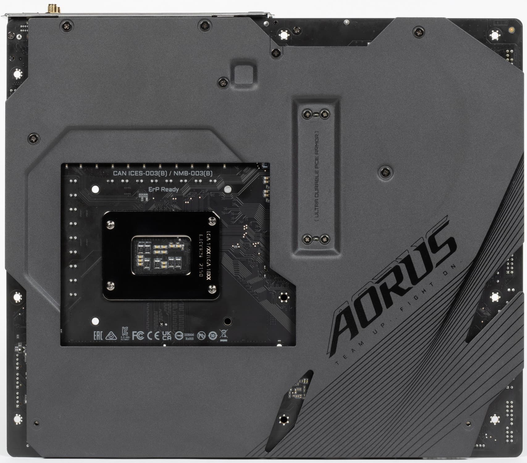 Материнская плата имеет бэкплейт, защитную пластину на оборотной стороне, которая также принимает участие в охлаждении в районе VRM через термопрокладки.