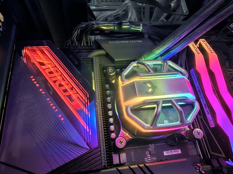 В арсенале платы также есть 4 порта SATA и 10 разъемов для вентиляторов. Система питания процессора очень мощная, способная обеспечить работу любых совместимых процессоров с приличным запасом на разгон (надо лишь включить нужные настройки в BIOS Setup). Плата имеет грамотную систему охлаждения каждого потенциально греющегося элемента, включая накопители в слотах M.2 (термопрокладки для охлаждения накопителей есть с обеих сторон). Сетевые возможности прекрасные: очень быстрый проводной контроллер 10 Гбит/с и один самый современный беспроводной. В числе плюсов платы можно упомянуть неплохую подсветку, включая широкие возможности для подключения дополнительных RGB-устройств.