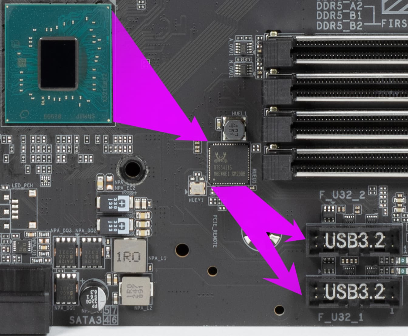 - 3 порта USB 3.2 Gen2x2: один реализован с помощью контроллера Realtek RTS5463 (на него потрачена одна линия USB 3.2 Gen1 от Z790) и представлен одним внутренним портом Type-C (для подключения к соответствующему разъему на передней панели корпуса); два других реализованы через два контроллера Realtek RTS5464 (каждый из них использует 1 линию PCIe от Z790) и представлены двумя портами Type-C на задней панели;