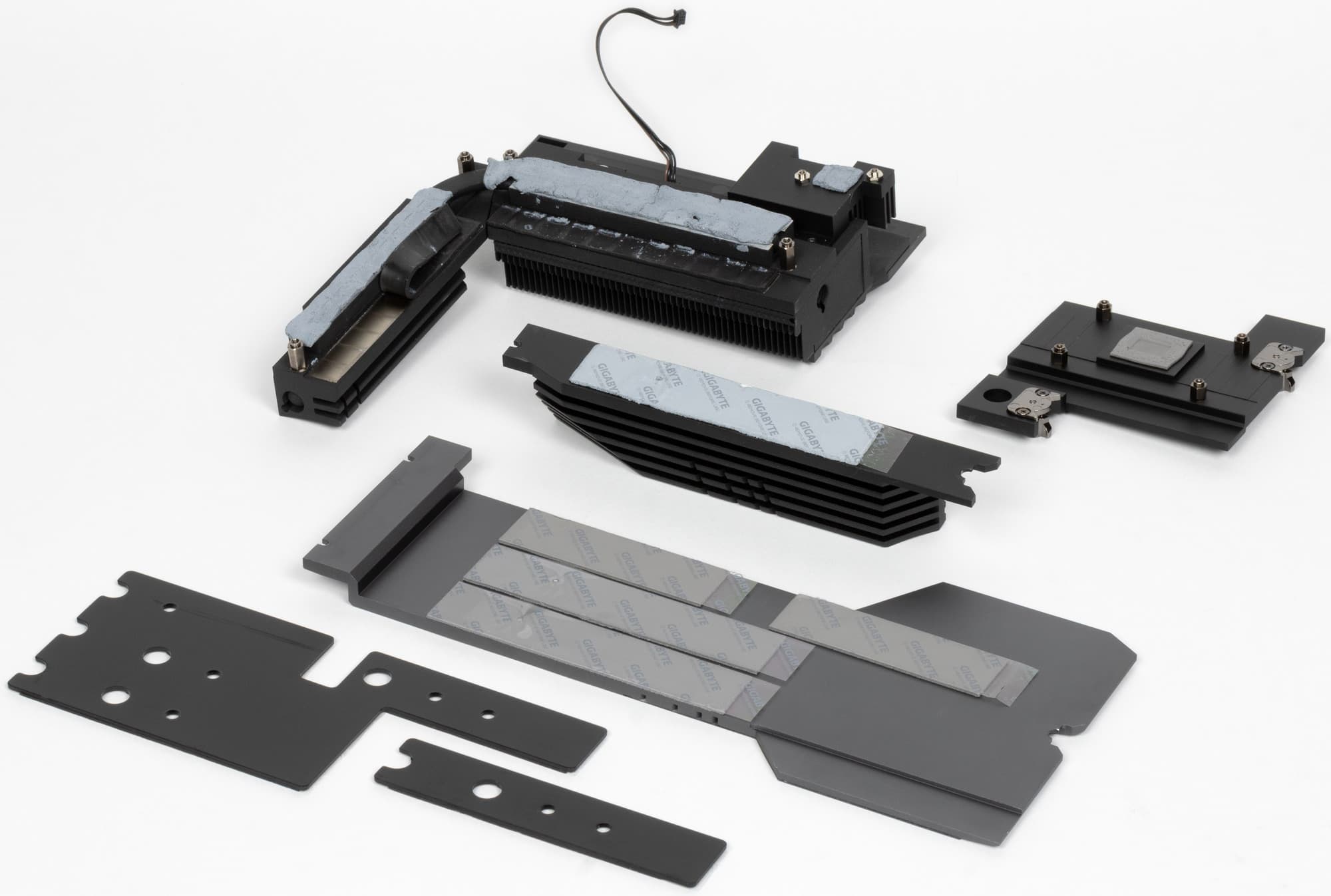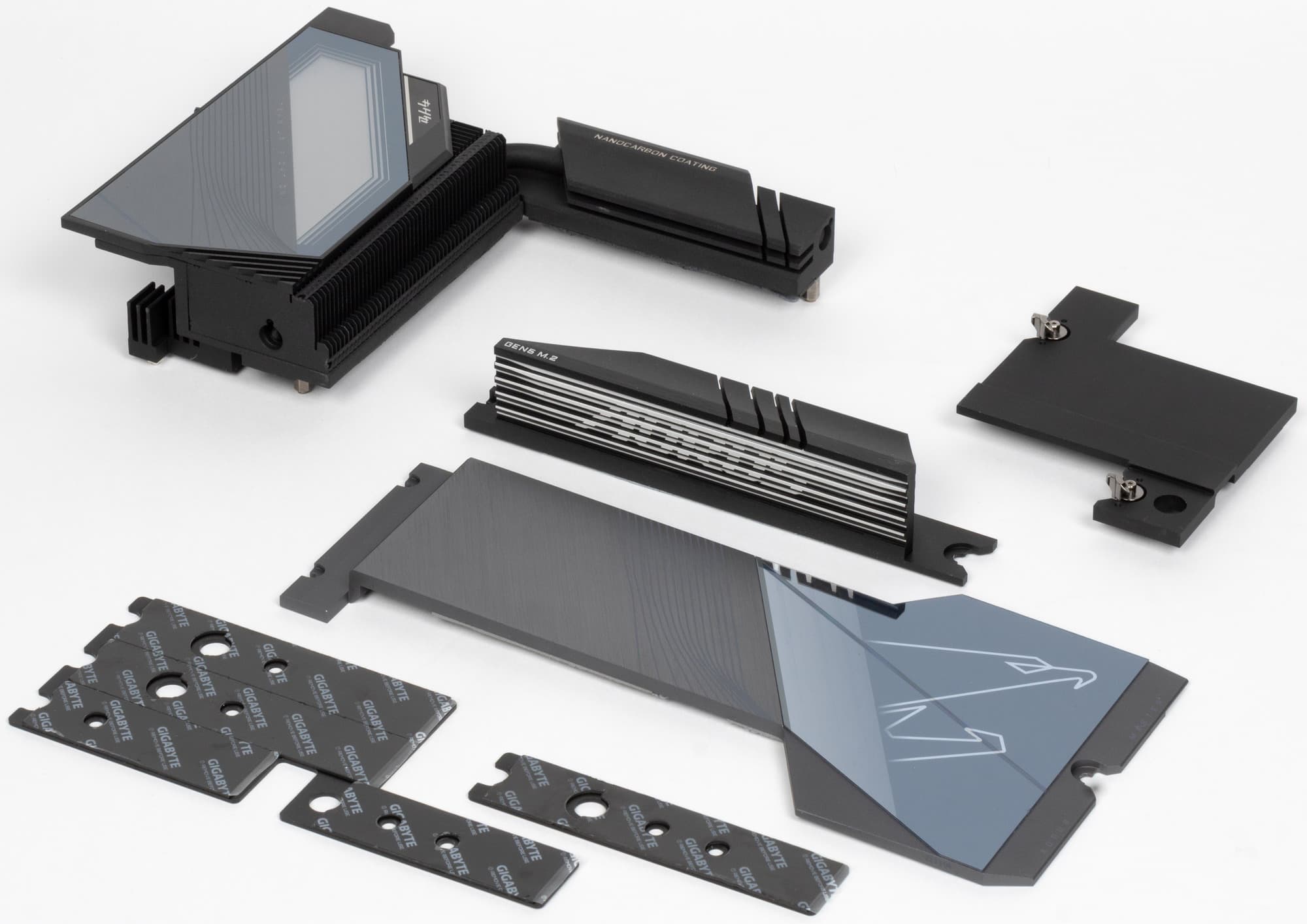 Все M.2 слоты имеют радиаторы. Верхний M2C_CPU обладает отдельным мощным радиатором, когда как остальные все слоты M.2 имеют общий радиатор.