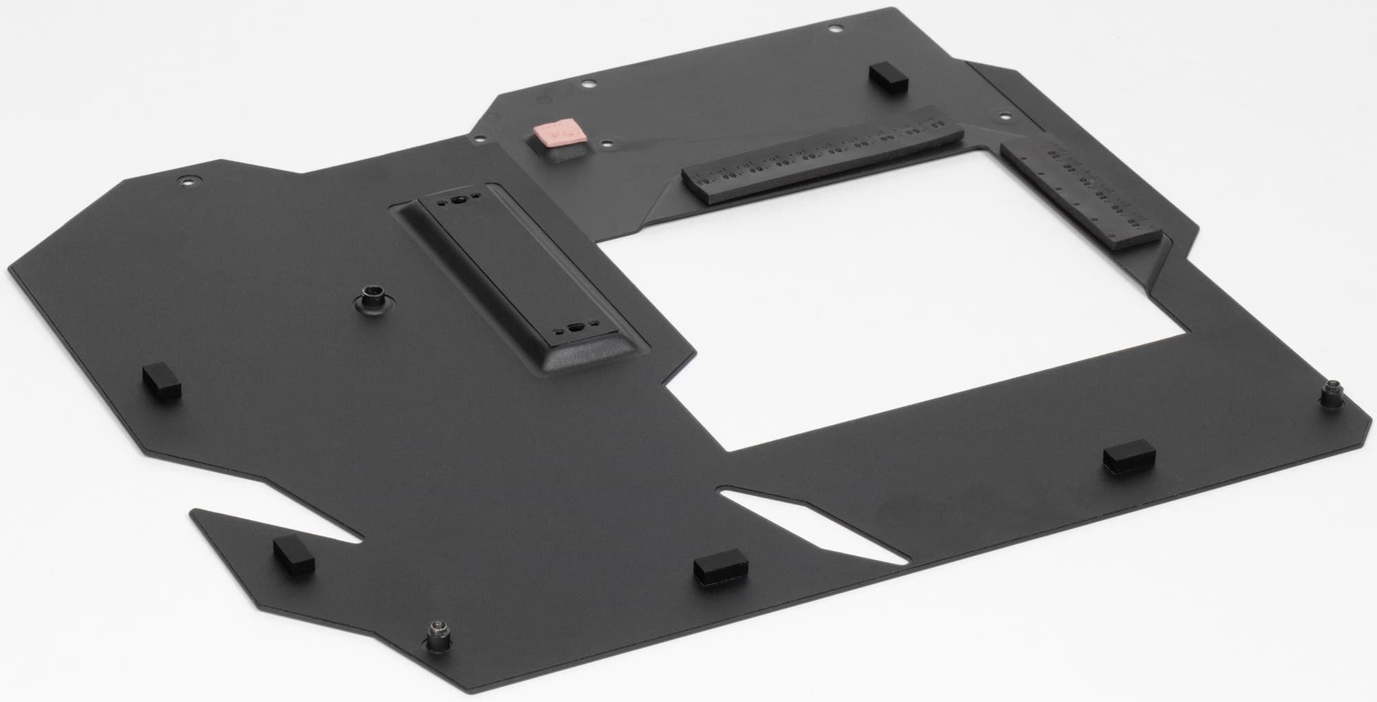 На оборотной стороне расположены несколько контроллеров и традиционные некоторые электронные логические элементы. Текстолит обработан неплохо: во всех точках пайки срезаны острые концы. На задней стороне установлена пластина из алюминия с наноуглеродным покрытием. Она помогает отводить тепло от задней стороны PCB через термоинтерфейс и обеспечивает жесткость материнской платы.