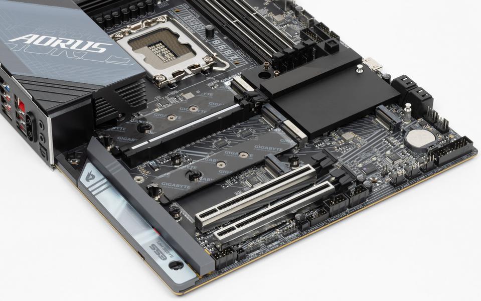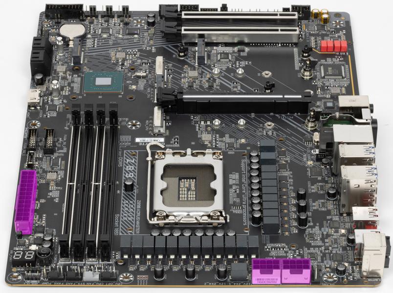 У нее имеется 23 порта USB разных видов, включая 2 самых быстрых USB4, один USB 3.2 Gen2×2 в виде внутреннего порта Type-C и 6 USB 3.2 Gen2. Также плата предлагает 3 слота PCIe х16, один из которых получает от процессора 16 линий PCIe 5.0, а два других работают в режимах х1 и x4 (подключены к чипсету). У платы 5 слотов M.2, три из которых подключены напрямую к процессору: один — линиями PCIe 4.0, второй — линиями PCIe 5.0, а третий делит линии PCIe 5.0 со слотом PCIe x16, вынуждая последний переходить в режим х8. Два других слота М.2 подключены к чипсету Z890 линиями PCIe 4.0.