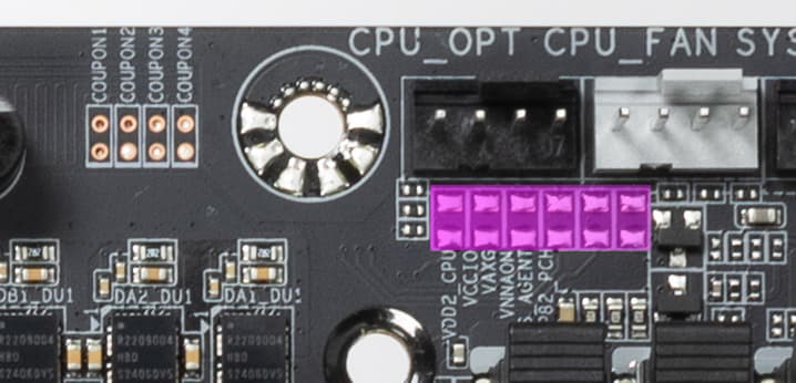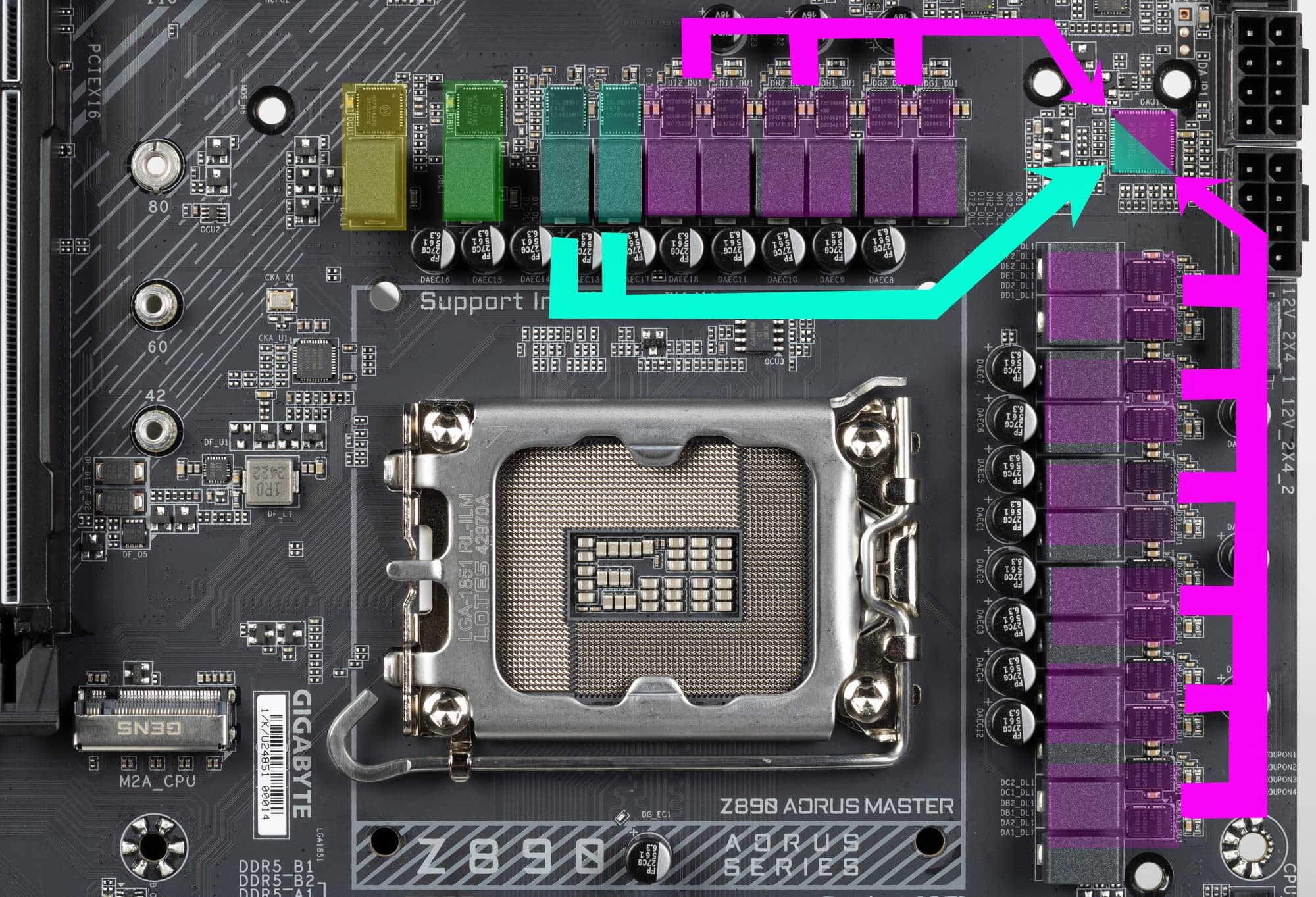 Управляет схемой VCore (выделено фиолетовым цветом) + VCCSA (выделено голубым цветом) ШИМ-контроллер RAA229130 от Renesas, при этом фазы питания VCore работают по параллельной схеме 9х2, то есть фактически контроллер управляет 9+2 = 11 фазами.