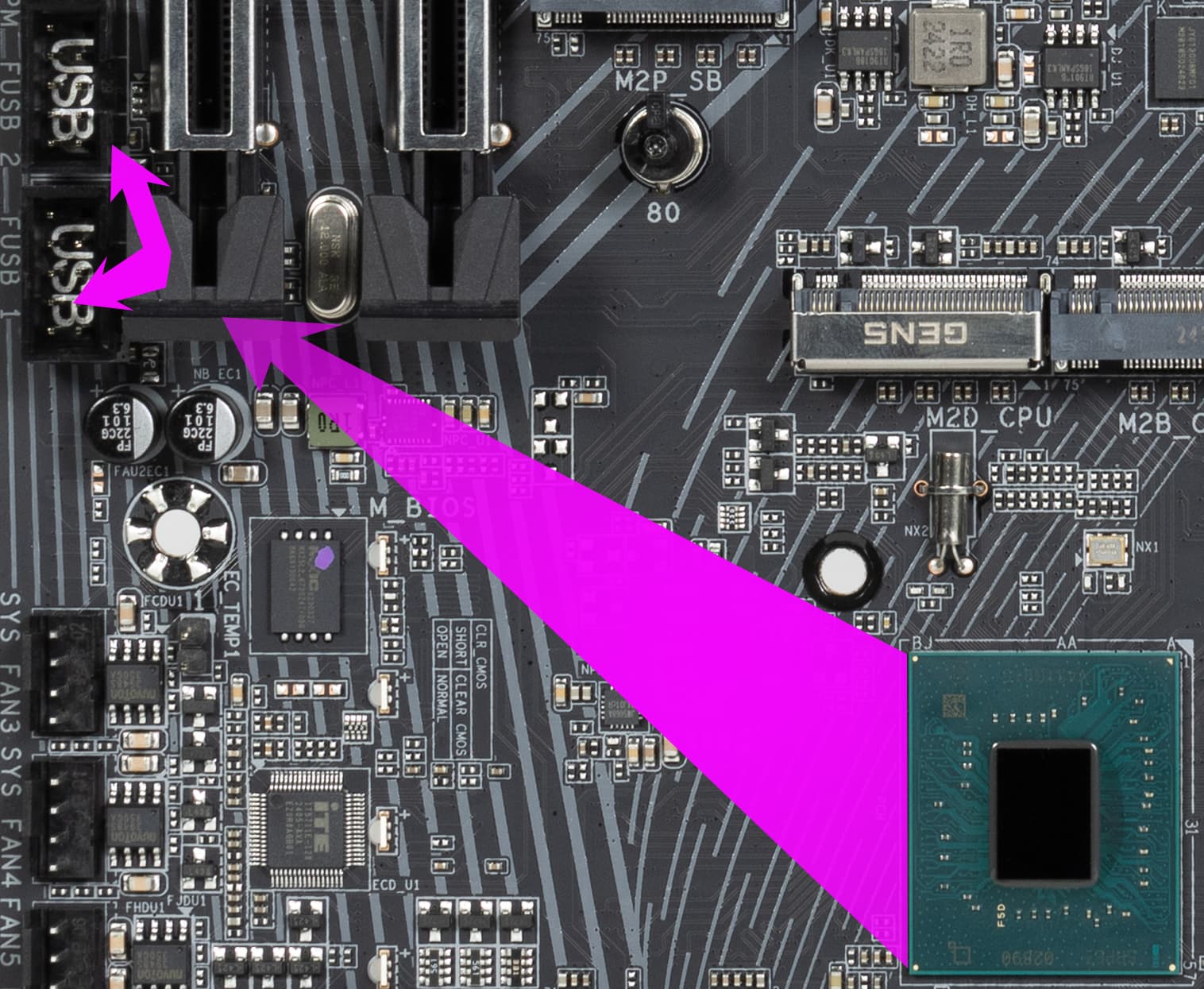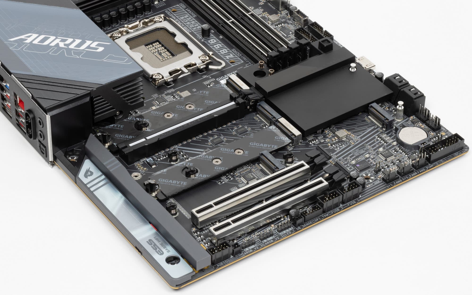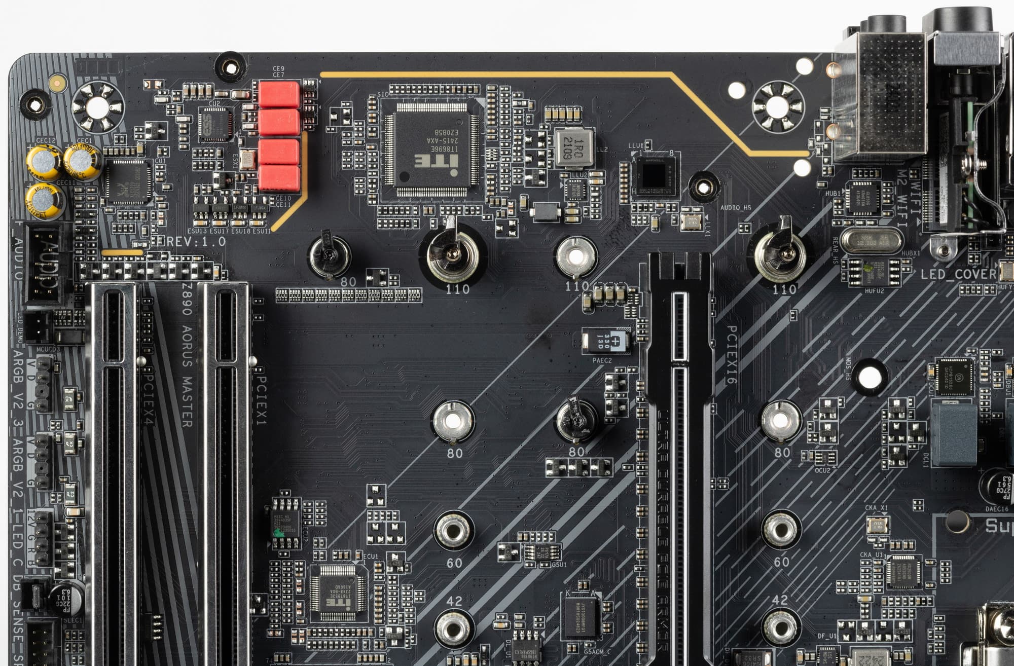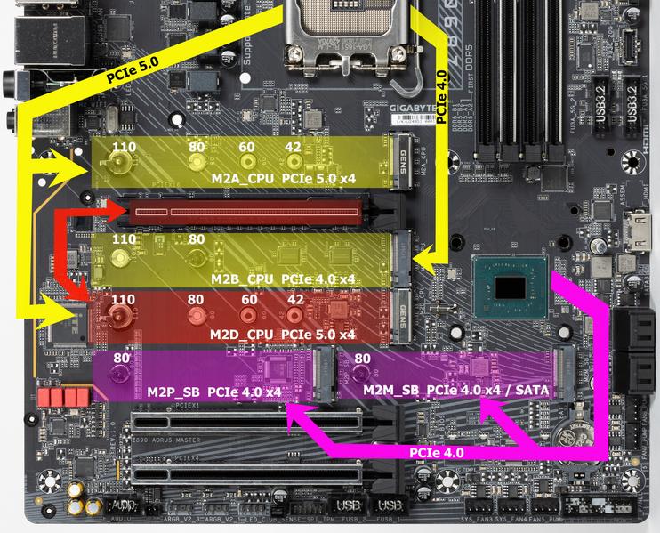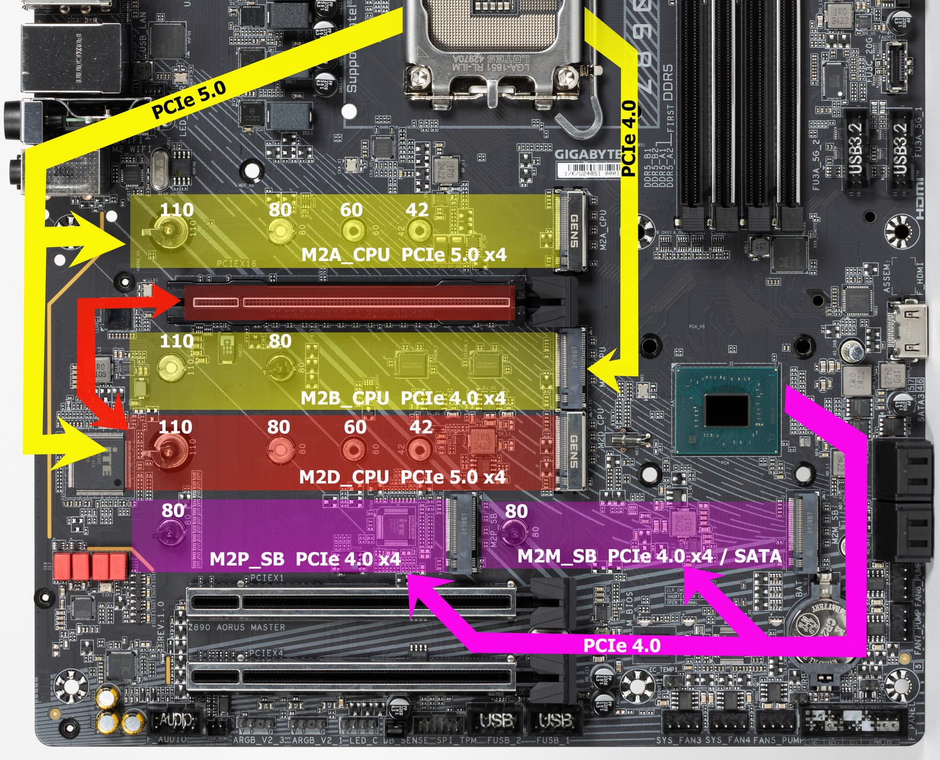 Четвертый и пятый слоты M.2 (M2P_SB, M2M_SB) получают данные от чипсета Z890, а первые три — от CPU, при этом M2D_CPU получает PCIe 5.0, деля ресурсы со слотом PCIe x16_1 (о чем я уже выше рассказывал), M2A_CPU штатно получает от процессора PCIe 5.0, а M2B_CPU получает от процессора PCIe 4.0.