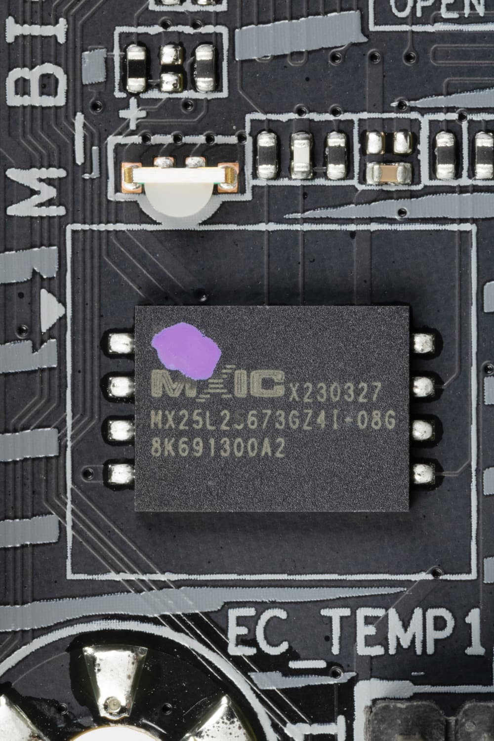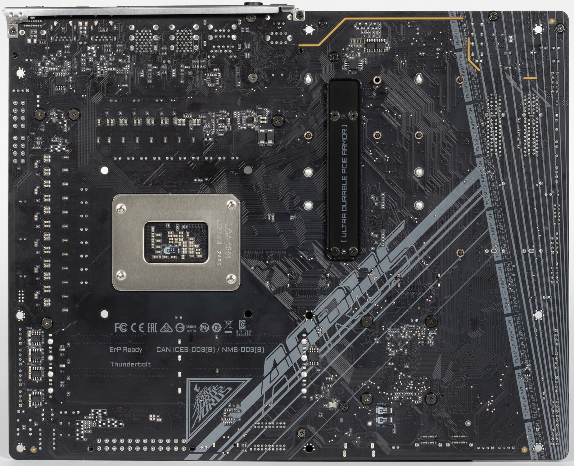 На оборотной стороне расположены традиционные некоторые электронные логические элементы, а также элемент жесткости конструкции слота PCIe x16_1. Текстолит обработан неплохо: во всех точках пайки срезаны острые концы. Защитной пластины (бэкплейта) нет.