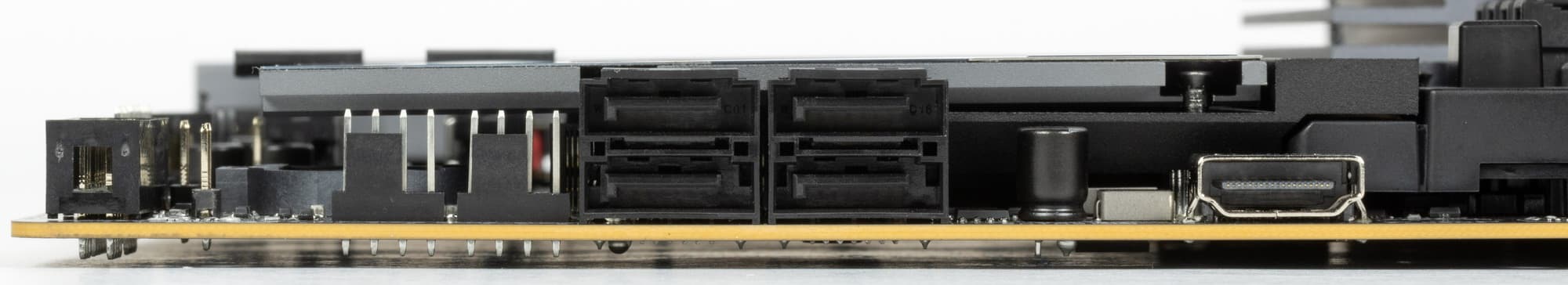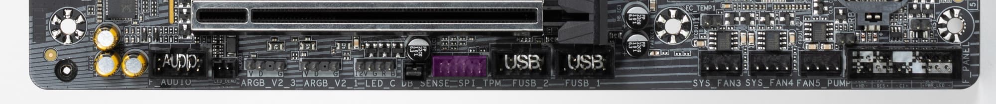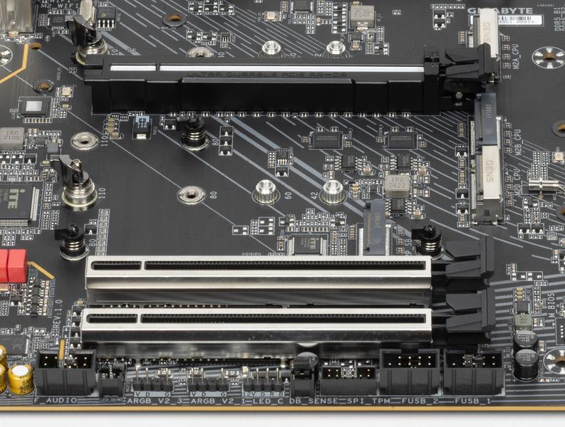 Все M.2 слоты имеют радиаторы. Верхний M2A_CPU обладает отдельным мощным радиатором, когда как остальные все слоты M.2 имеют общий радиатор. Слоты M.2, поддерживающие PCIe 5.0 (M2A_CPU, M2D_CPU) кроме верхних радиаторов еще имеют радиаторы для охлаждения тыльной стороны модулей.