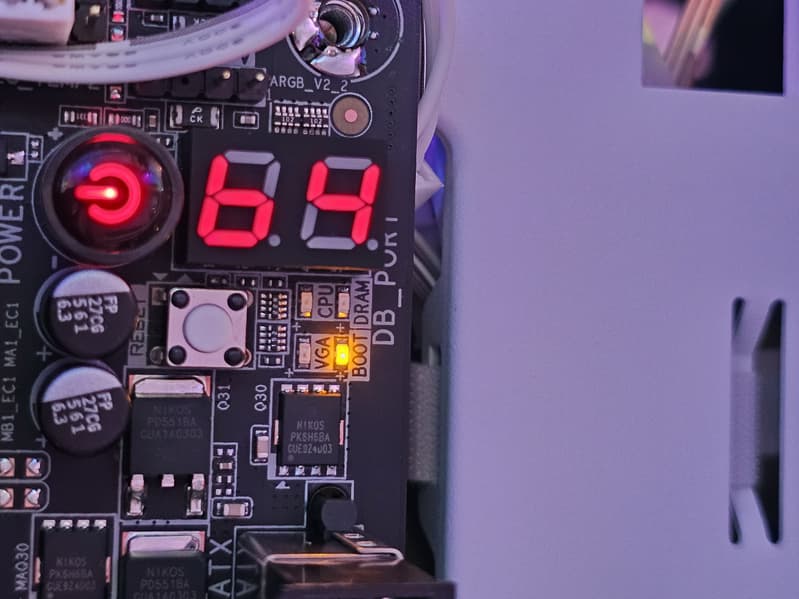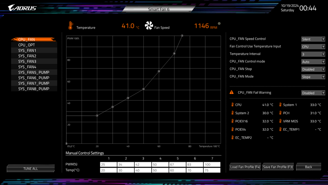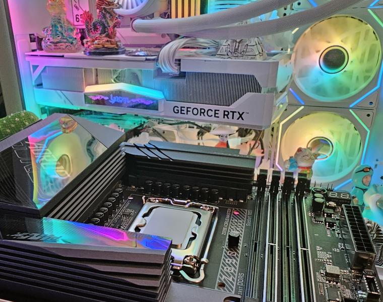 В арсенале платы также есть 4 порта SATA и 10 разъемов для вентиляторов. Система питания процессора очень мощная, способная обеспечить работу любых совместимых процессоров с приличным запасом на разгон. Плата имеет грамотную систему охлаждения каждого потенциально греющегося элемента, включая накопители в слотах M.2 (термопрокладки для охлаждения накопителей в двух слотах PCIe 5.0 есть с обеих сторон). Сетевые возможности прекрасные: очень быстрый проводной контроллер 10 Гбит/с и один самый современный беспроводной — Wi-Fi 7 + Bluetooth 5.4. В числе плюсов платы можно упомянуть неплохую стильную подсветку, а также широкие возможности для подключения дополнительных RGB-устройств.