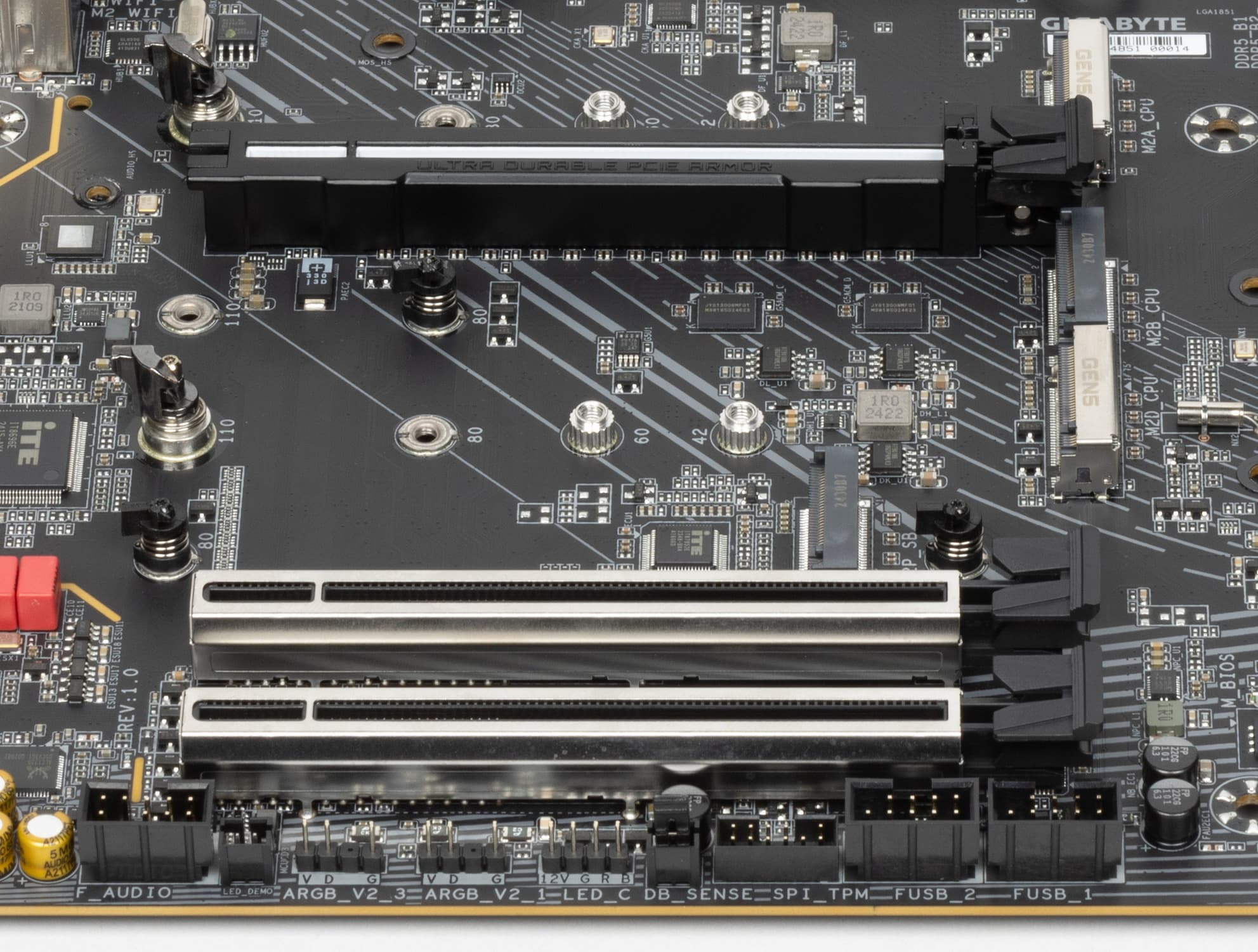 Всего на плате есть 3 слота: один PCIe x16_1 (для видеокарт или других устройств) и два PCIe x16_2/3 (но фактически имеющие 1 линию PCIe 3.0 и 4 линии PCIe 4.0 соответственно).