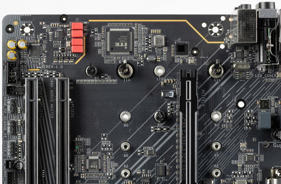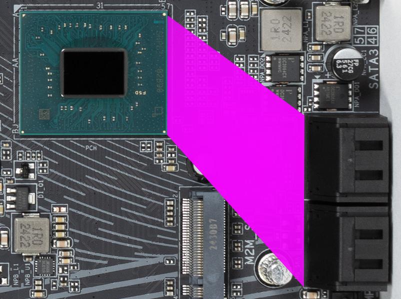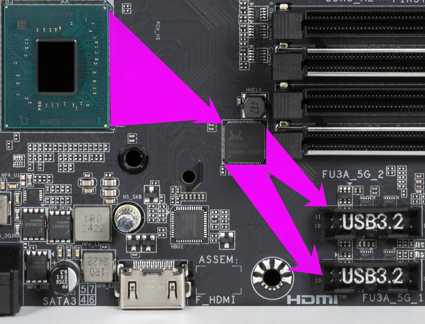 16 линий PCIe оказались занятыми, плюс 4 порта SATA. Связь с аудиокодеками через HDA (эмуляцию шины PCI) теперь невозможна, так что в данном случае линия USB 2.0 расходуется на связь с Realtek RTL1220, плюс один USB 2.0 расходуется на поддержку BT, а также контроллеры GL850G, RTS5411, RTS5464, для своих нужд используют сигнальные линии USB 2.0 и 3.2 Gen1/2. Детально об этом ниже в разделе USB-портов.