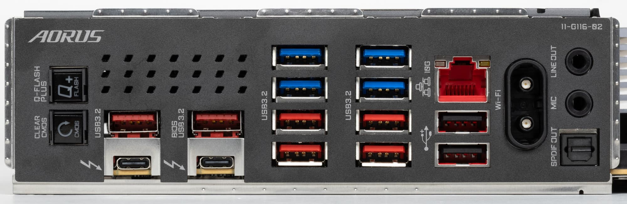 - 6 портов USB 3.2 Gen2: все реализованы через Z890 и представлены на задней панели портами Type-A (красного цвета);