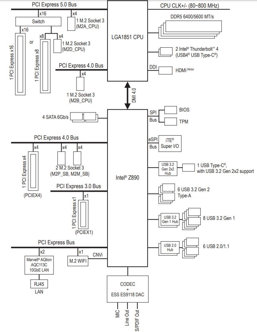 При этом взаимодействие с Z890 идет по особому каналу Digital Media Interface 4.0 (DMI 4.0 x8). Serial Peripheral Interface (SPI) используется для взаимодействия с системой UEFI/BIOS, а шина Low Pin Count (LPC) — для связи с устройствами ввода/вывода, не требующими высокой пропускной способности (контроллерами вентиляторов, TPM, старой периферии). HDA более не используется, связь с аудиокодеками идет с помощью линий USB 2.0.