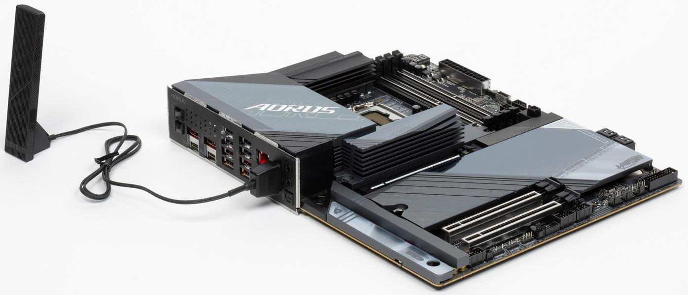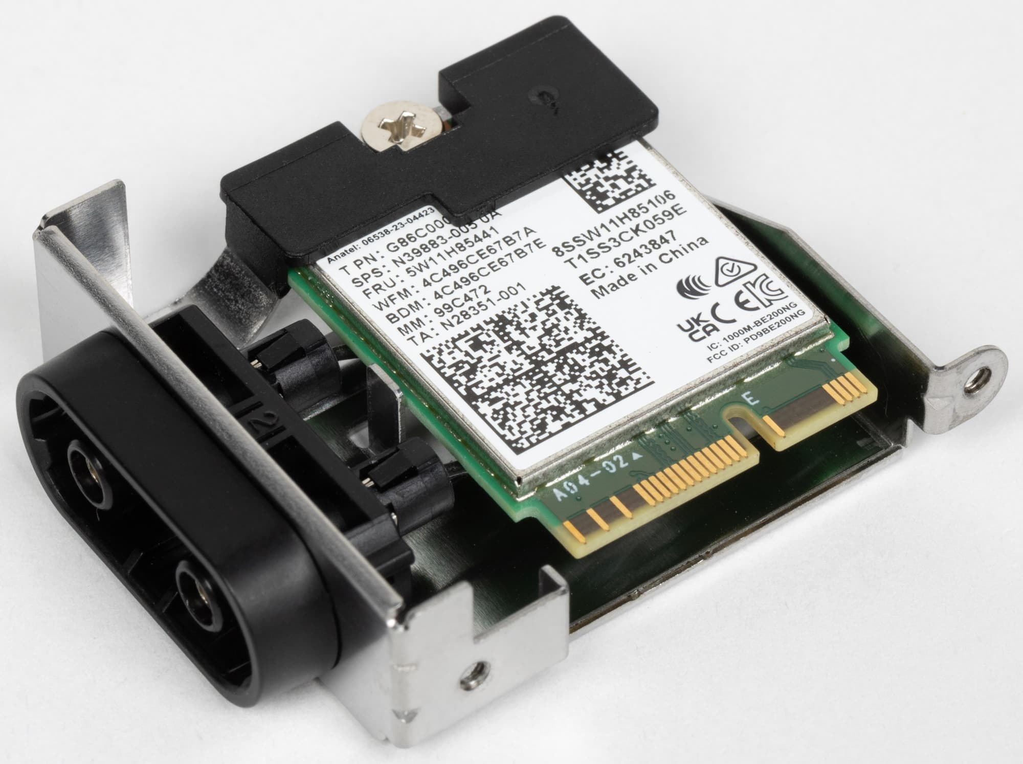 Имеется и комплексный беспроводной адаптер на контроллере Intel BE200, через который реализованы Wi-Fi 7 (802.11a/b/g/n/ac/ax/be, 2,4/5/6 ГГц) и Bluetooth 5.4. Он установлен в слот M.2 (E-key), и его разъемы для выносных антенн выведены на заднюю панель.