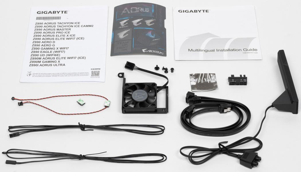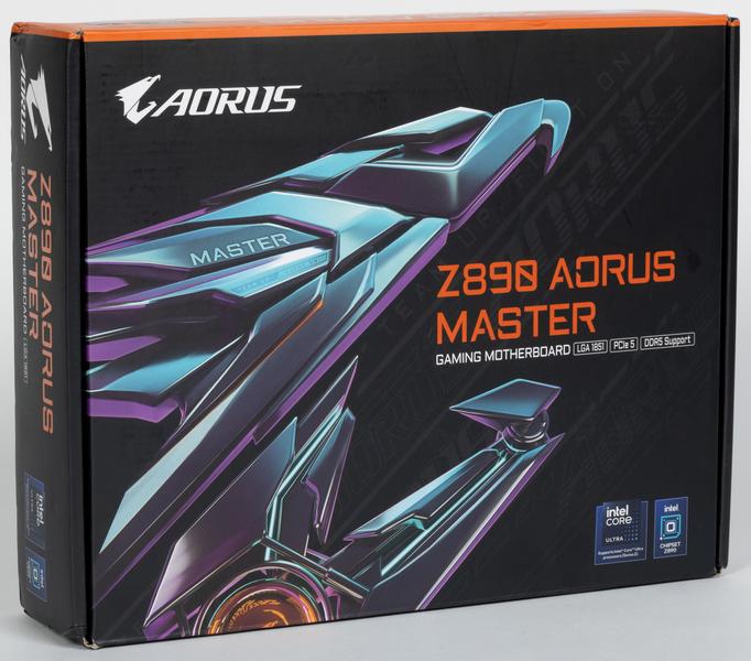 Gigabyte Z890 Aorus Master поставляется в традиционной коробке фирменного «cоколиного» дизайна серии Aorus. Комплект размещен под платой в отдельных отсеках.