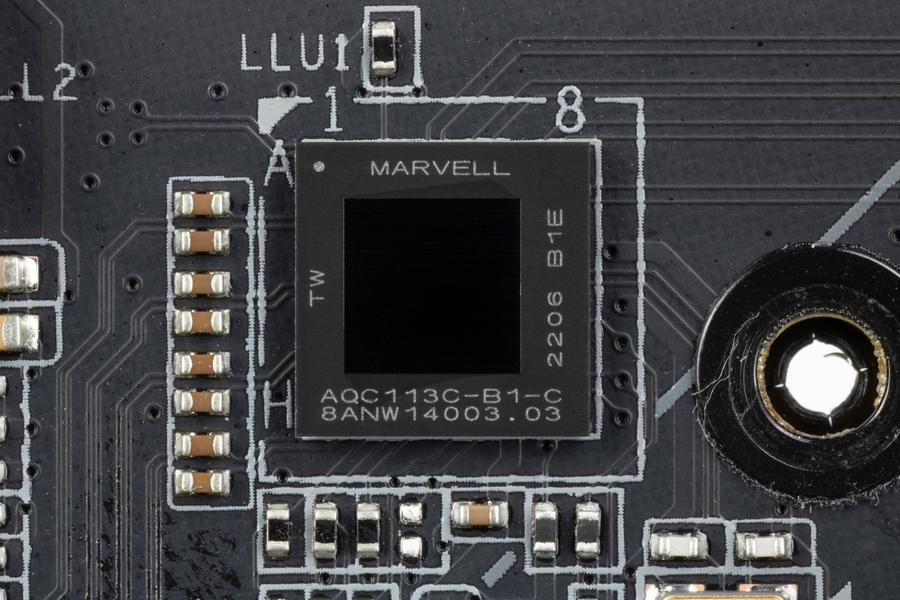Материнская плата оснащена средствами связи очень хорошо. Имеется очень скоростной Ethernet-контроллер Marvell Aqtion AQC113, способный работать по стандарту 10 Гбит/с.