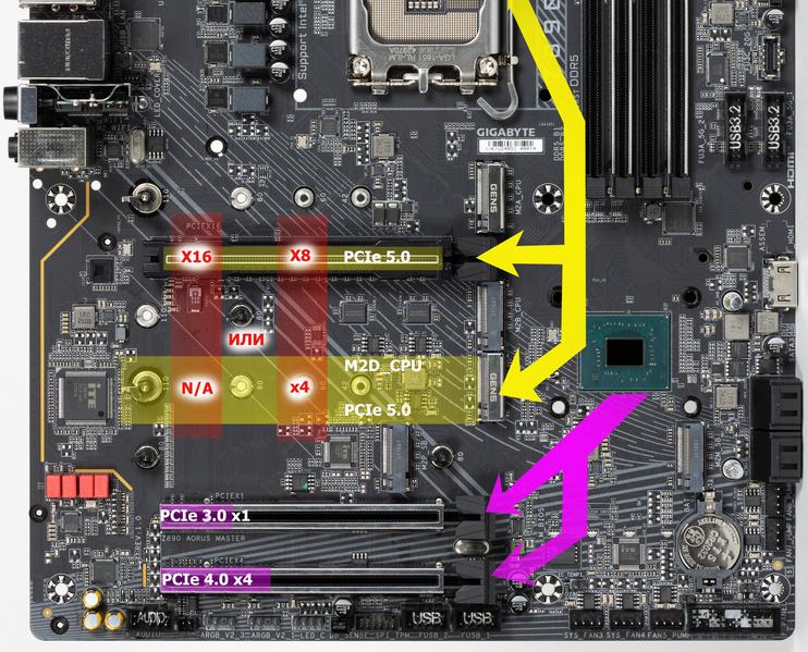 - Слот PCIe x16_1 имеет 8 линий, слот M2D_CPU занимает до 4 линий