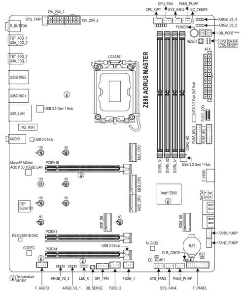 Форм-фактор ATX имеет размеры до 305×244 мм, а E-ATX — до 305×330 мм. Материнская плата Gigabyte Z890 Aorus Master имеет размеры 305×244 мм, поэтому выполнена в форм-факторе ATX, и на ней имеются 9 монтажных отверстий для установки в корпус. Однако следует иметь в виду, что одно из девяти монтажных отверстий перекрыто радиатором для слота M.2.