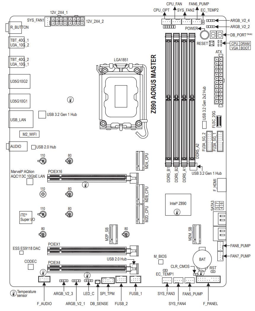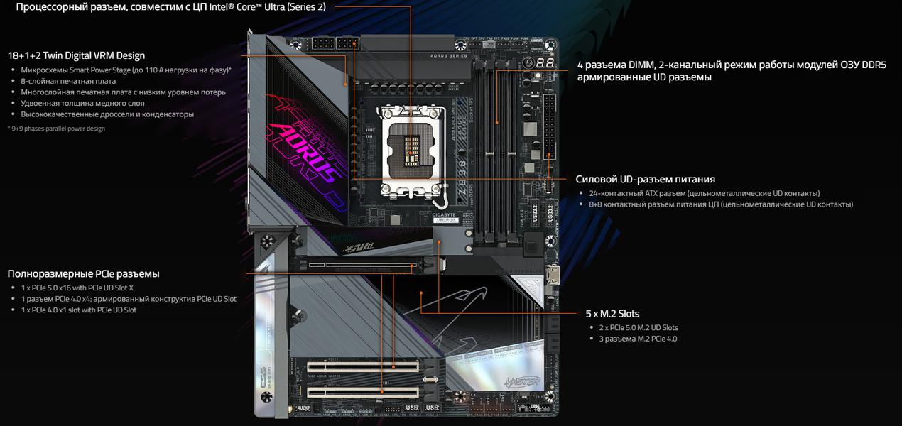 | Разъемы для накопителей | 4 × SATA 6 Гбит/с (Z890) 1 × M.2 (M2A_CPU, CPU, PCIe 5.0 x4 для устройств формата 2242/2260/2280/2580/22110/25110) 1 × M.2 (M2B_CPU, CPU, PCIe 4.0 x4 для устройств формата 2280/22110) 1 × M.2 (M2D_CPU, CPU, PCIe 5.0 x4 для устройств формата 2242/2260/2280/22110)* 1 × M.2 (M2P_SB, Z890, PCIe 4.0 x4 для устройств формата 2280) 1 × M.2 (M2M_SB, Z890, PCIe 4.0 x4/SATA для устройств формата 2280) |