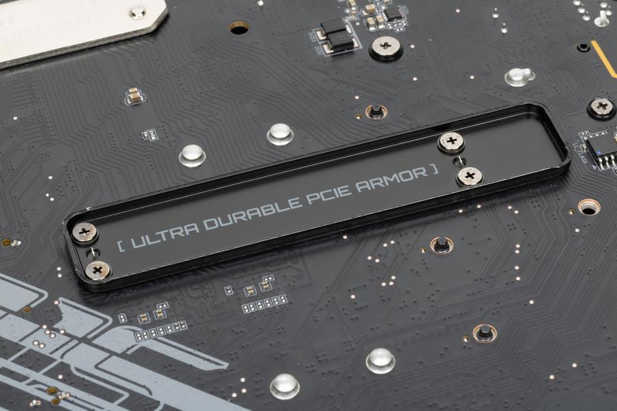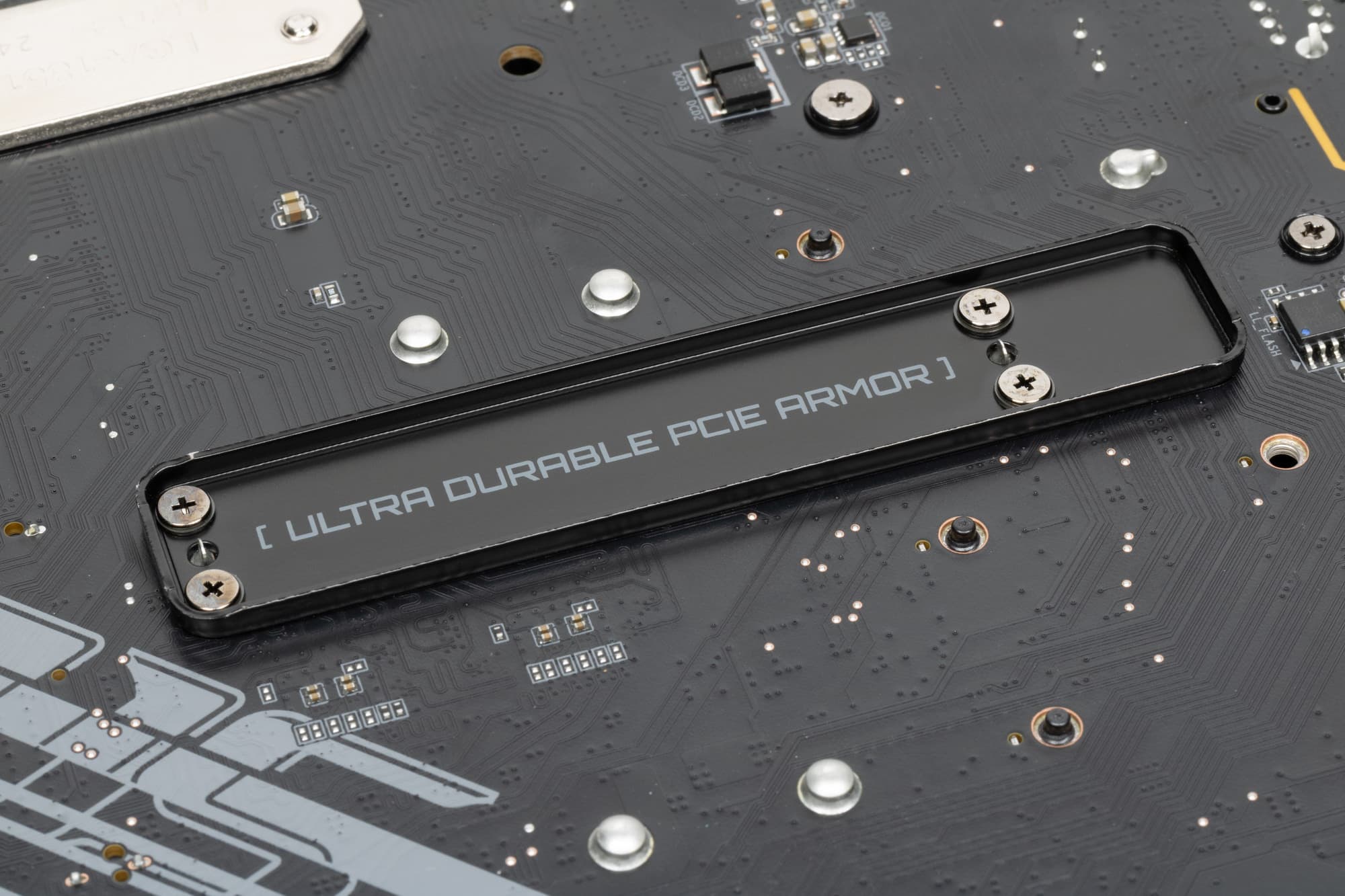 А слот PCIe x16_1 еще дополнительно оборудован усилением жесткости конструкции с помощью металлической пластины из цинкового сплава с оборотной стороны матплаты.