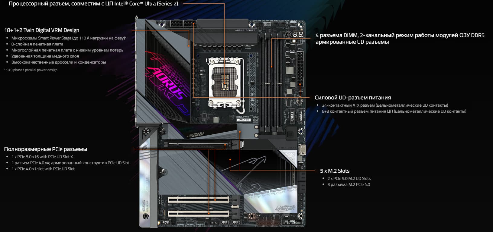 Gigabyte Z890 Aorus Master — очень мощный, современный и весьма дорогой вариант материнской платы из серии Aorus на базе последнего чипсета Intel Z890. Это не самая старшая модель в линейке, но ее стоимость ожидается в районе 60-70 тысяч рублей. Плата весьма навороченная, имеет поддержку процессоров Intel Core Ultra поколения 200, создана для геймеров и энтузиастов-оверклокеров.