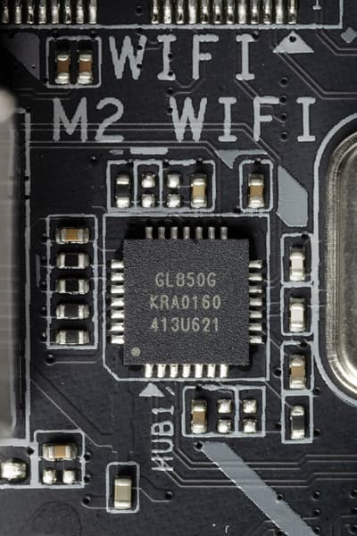 - 6 портов USB 2.0/1.1: 4 реализованы через контроллер Genesys Logic GL850G (на него потрачена 1 линия USB 2.0 от Z890) и представлены двумя внутренними разъемами (каждый на 2 порта); остальные 2 реализованы через второй контроллер Genesys Logic GL850G (на него потрачена 1 линия USB 2.0 от Z890) и представлены на задней панели портами Type-A (черного цвета).