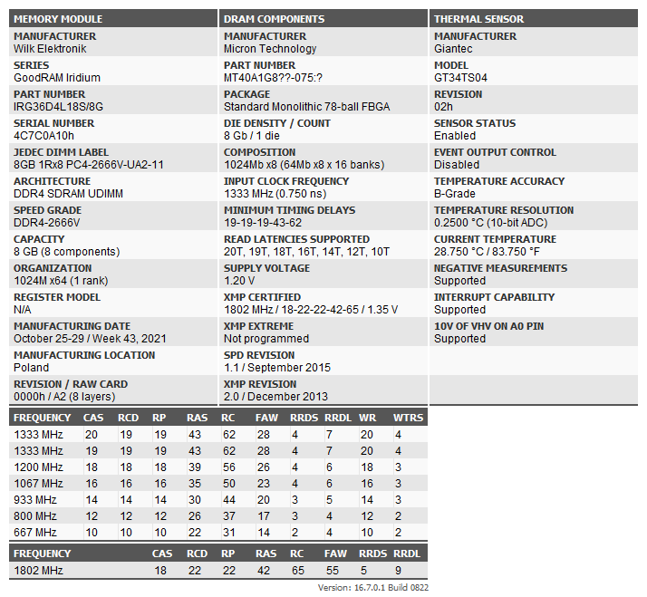 Содержание полностью соответствует форме. Анонсировались чипы Micron — они и есть. Обратить внимание стоит разве что на наличие термодатчиков — зачастую их нет даже в более дорогих модулях. Сертификацию модули прошли как DDR4-2666, что тоже неплохо: как минимум в таком режиме они способны работать даже на платах без выбора XMP-профиля и/или не поддерживающих разгон памяти. XMP-профиль тут один: на частоту 3600 МГц с задержками по схеме 18-22-22. Что тоже было обещано при анонсе и прописано в спецификациях — все как аптеке.