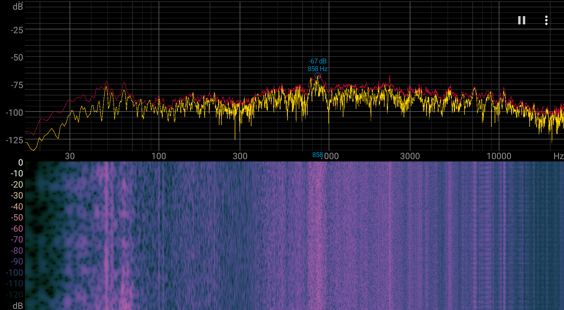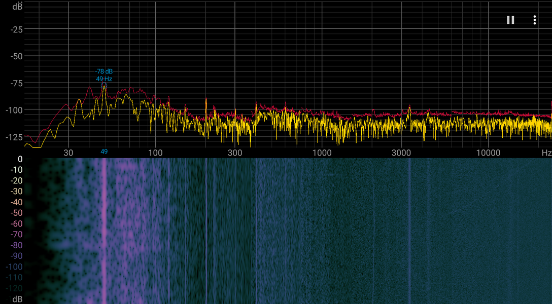 В состоянии «из коробки» этот ПК является шумным устройством — даже очень шумным, учитывая, что топовой видеокартой внутри и не пахнет. Причем если с шумом под максимальной нагрузкой еще как-то можно было бы смириться, поскольку реальные пользователи не будут запускать на нем ничего, даже отдаленно напоминающего стресс-тесты, то высокий шум в простое и удивляет, и раздражает. Под максимальной нагрузкой характер шума более-менее ровный, но какое-то низкочастотное стрекотание отчетливо слышно. Спектрограмма, полученная при максимальной нагрузке на процессор, в основном ровная, и в диапазоне частот, где звуки могут вызывать особенное раздражение, пиков с высокой интенсивностью нет: