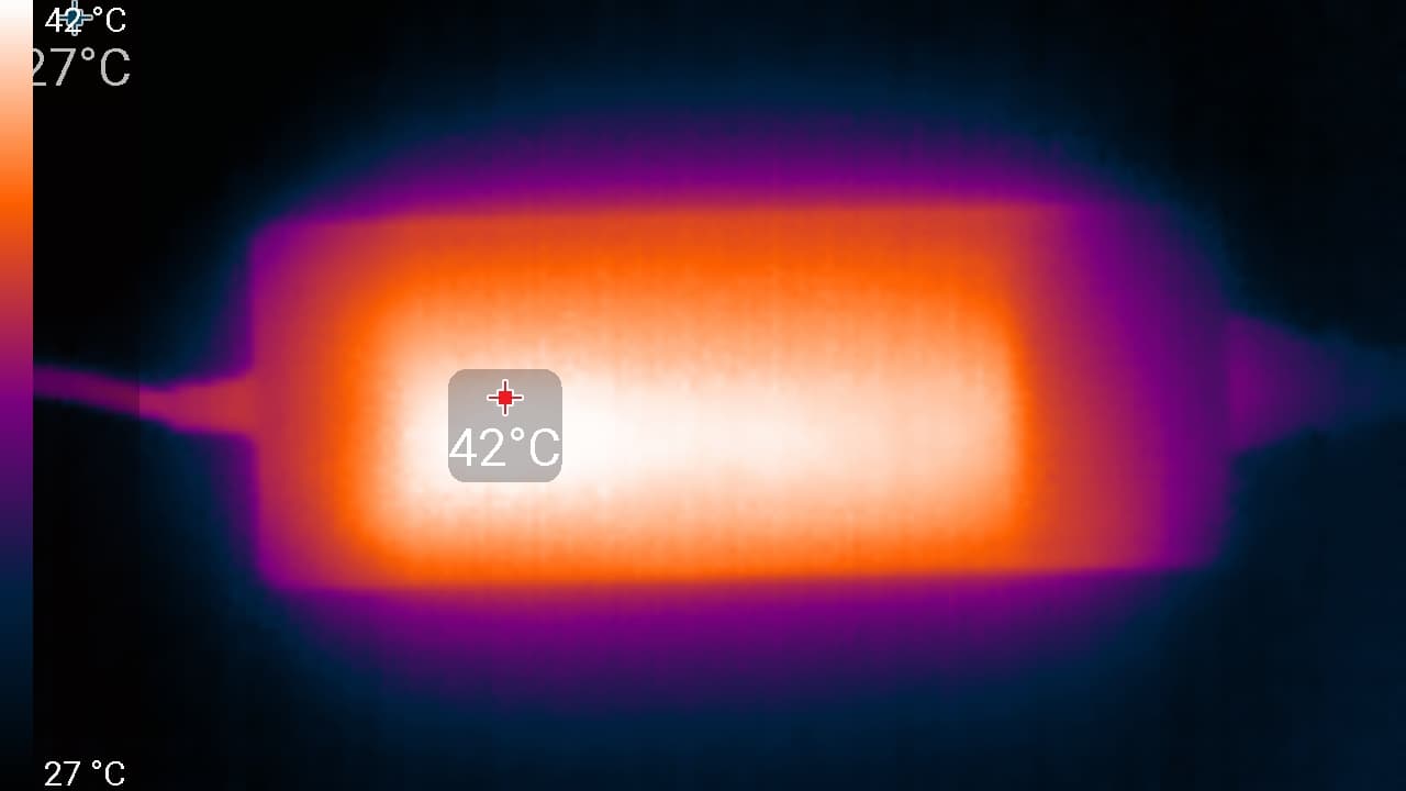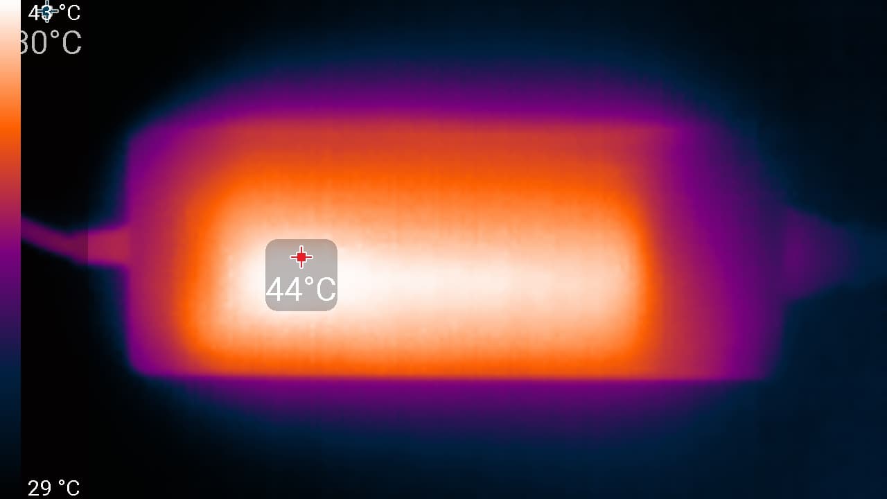 Под максимальной нагрузкой нагрев корпуса ПК не очень высокий. Максимум температуры на снимке выше приходится на разъем HDMI, на который выдувается горячий воздух. Нагрев блока питания небольшой, но лучше ничем его не накрывать.