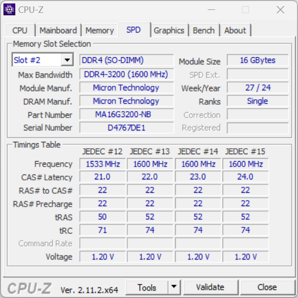 Во втором слоте упомянутого конструктива установлен единственный модуль оперативной памяти DDR4-3200 на 16 ГБ (Micron MA016G3200-NB), поэтому ОЗУ работает в одноканальном режиме.
